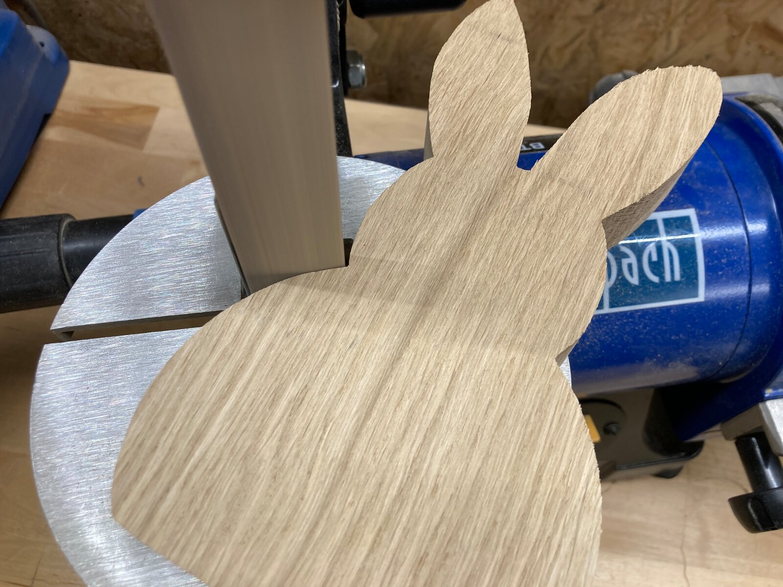Jetzt benötigen wir unsere Vorlagen (hier downloaden oder frei Hand erstellen). Für den Deko-Osterhasen die Vorlage mit einem Bleistift auf die Eichenplatte übertragen. Für die Ostereier die Vorlage auf die vorbereitete Sperrholzplatte legen und ebenfalls mit einem Bleistift übertragen. Danach geht es auch schon ans Aussägen mit der Bandsäge.