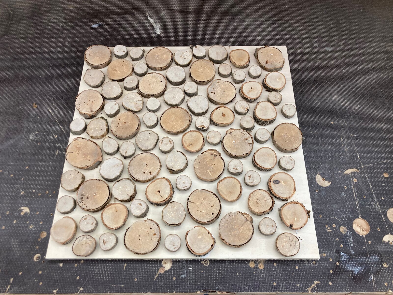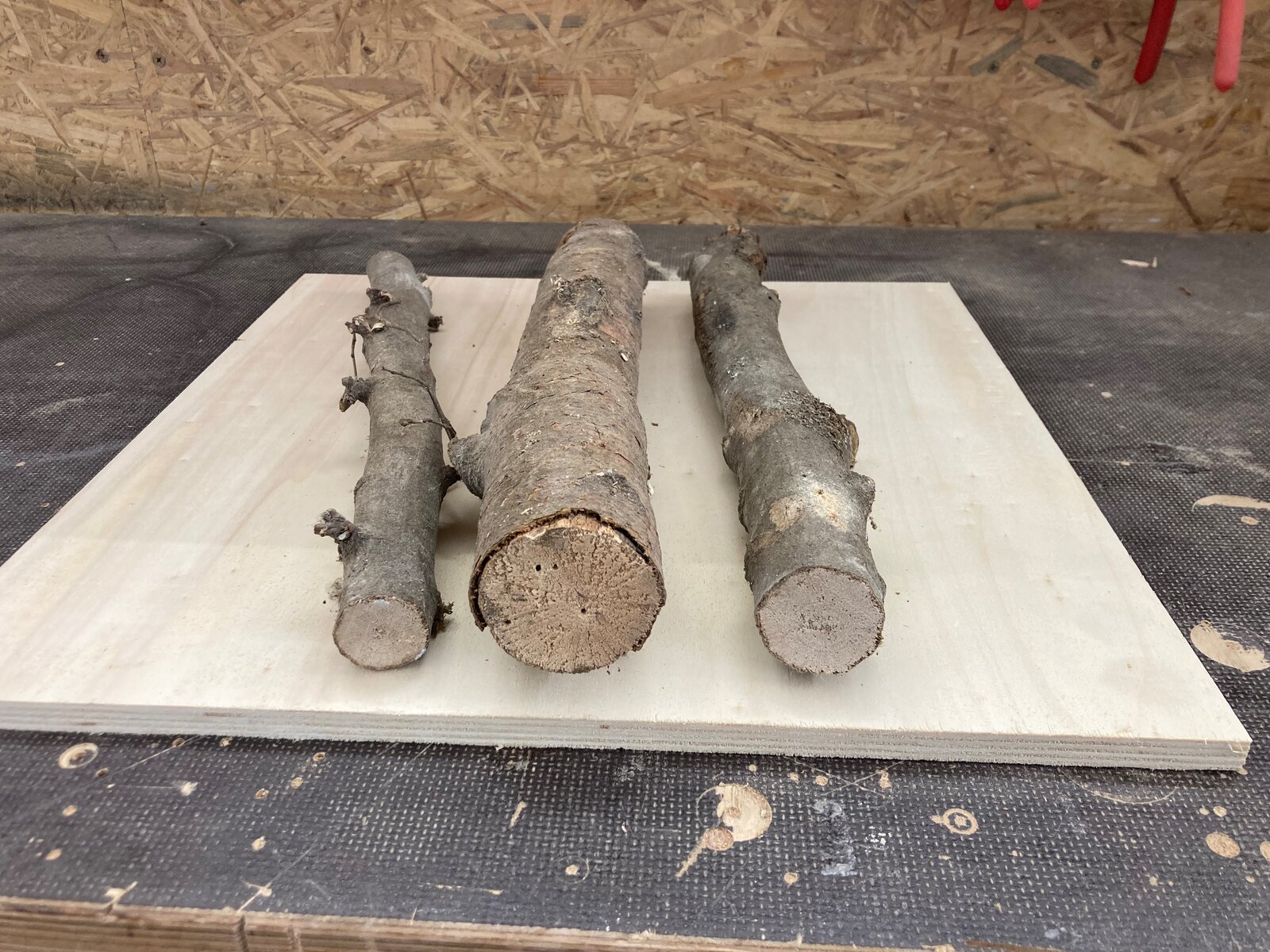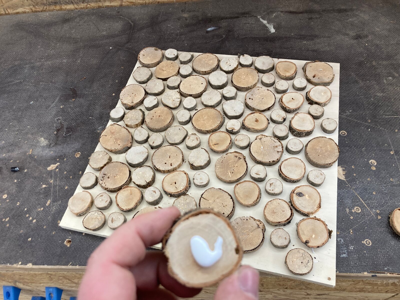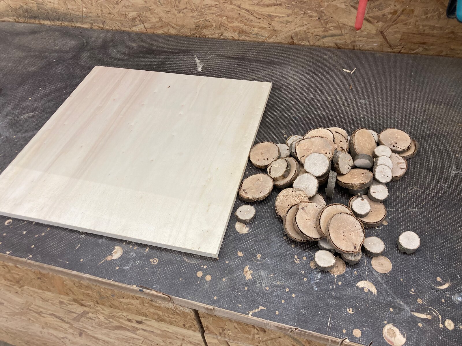- Schritt 2 – Ostereier: Holzscheiben auf Sperrholzplatte kleben