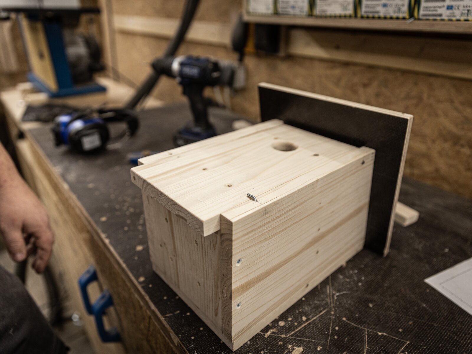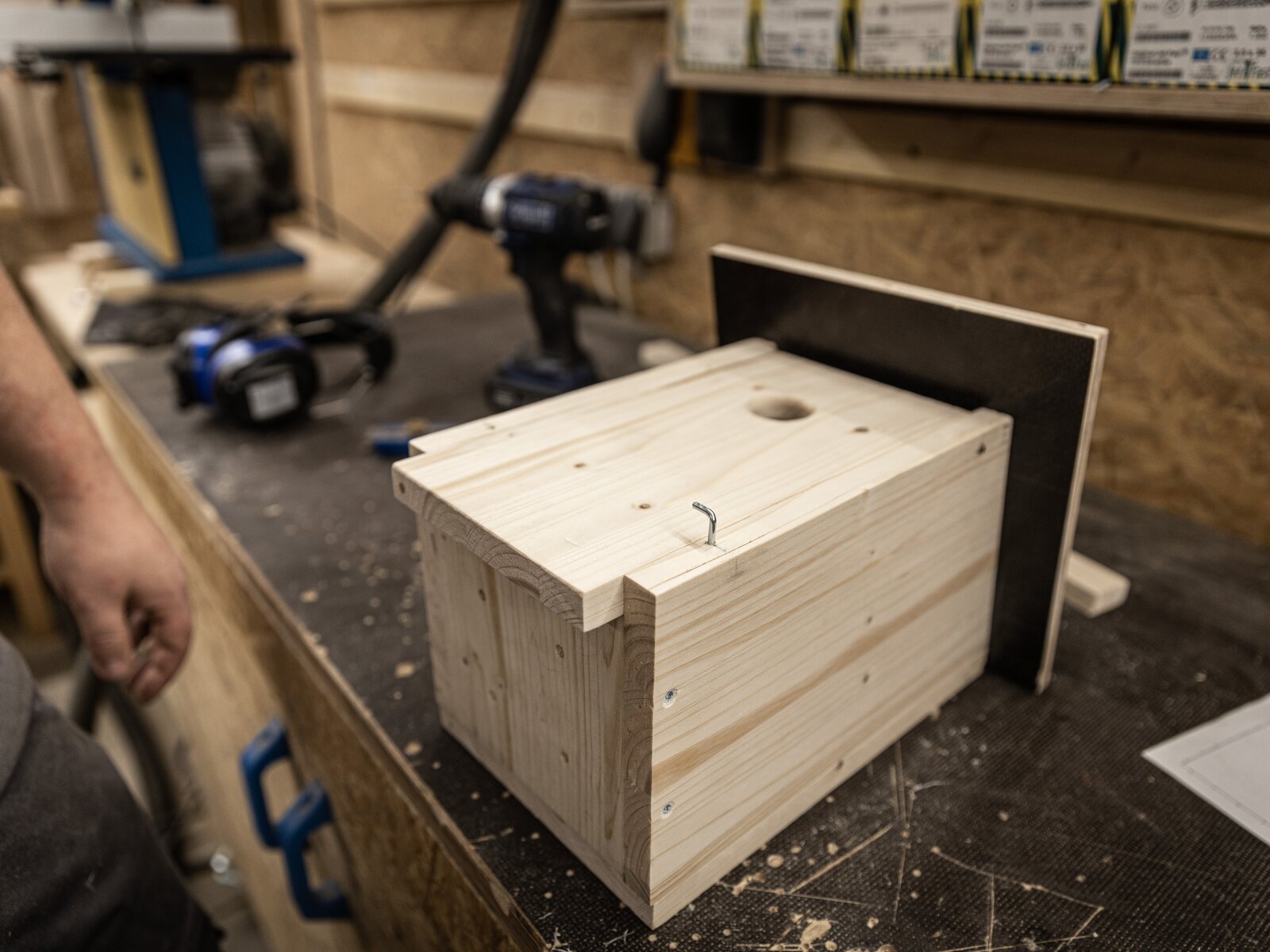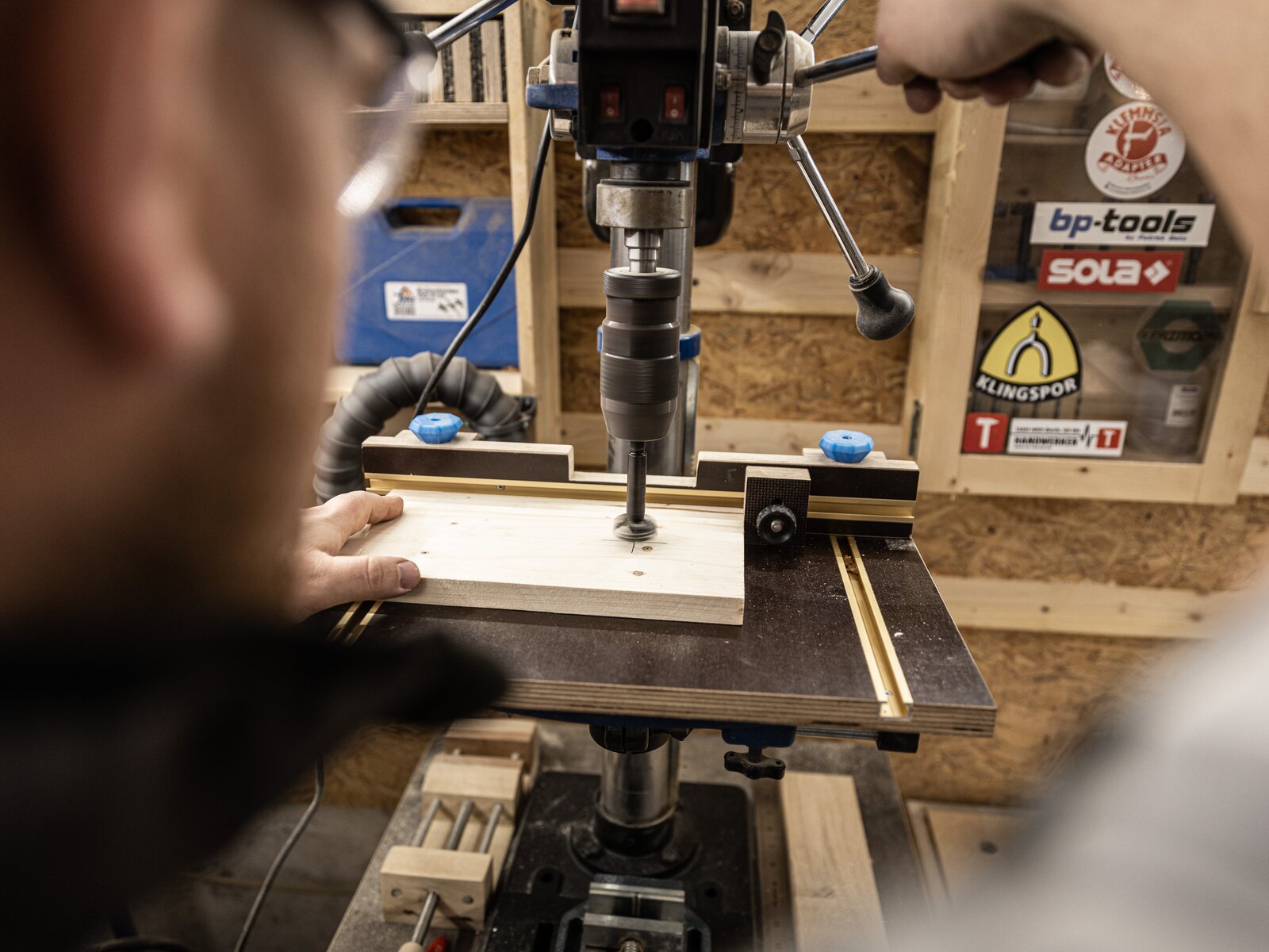 Jetzt können die Schraublöcher mit einer Tischbohrmaschine oder einem Akkuschrauber vorgebohrt und gesenkt werden. Das Flugloch wird ebenfalls mithilfe einer Tischbohrmaschine mit Forstnerbohrer gebohrt und anschließend mit einem Fräser abgerundet. Zum Schluss wird auch der Boden des Nistkastens mit 4 Lüftungslöchern ausgestattet, auch diese werden mit der Tischbohrmaschine gebohrt.