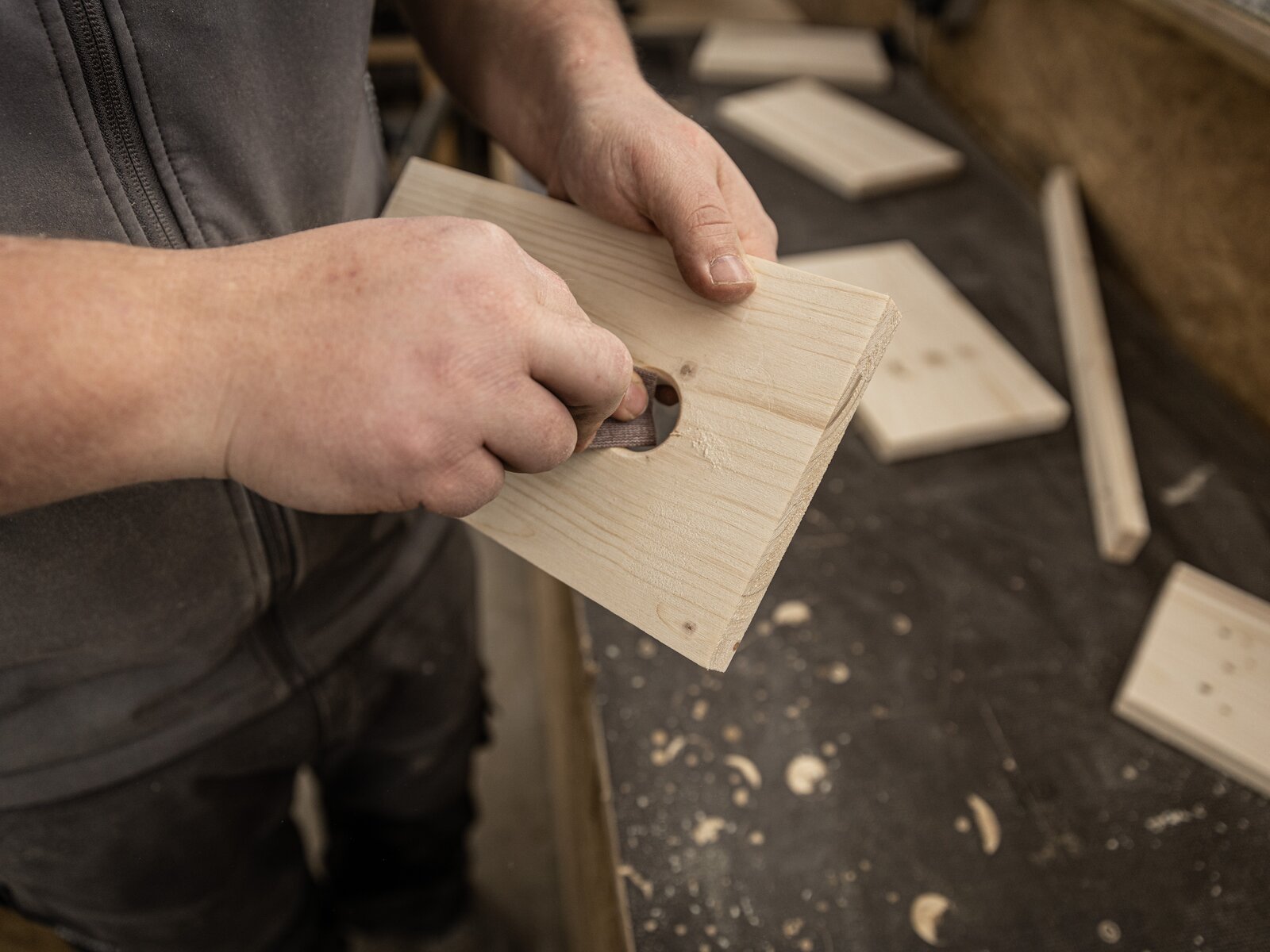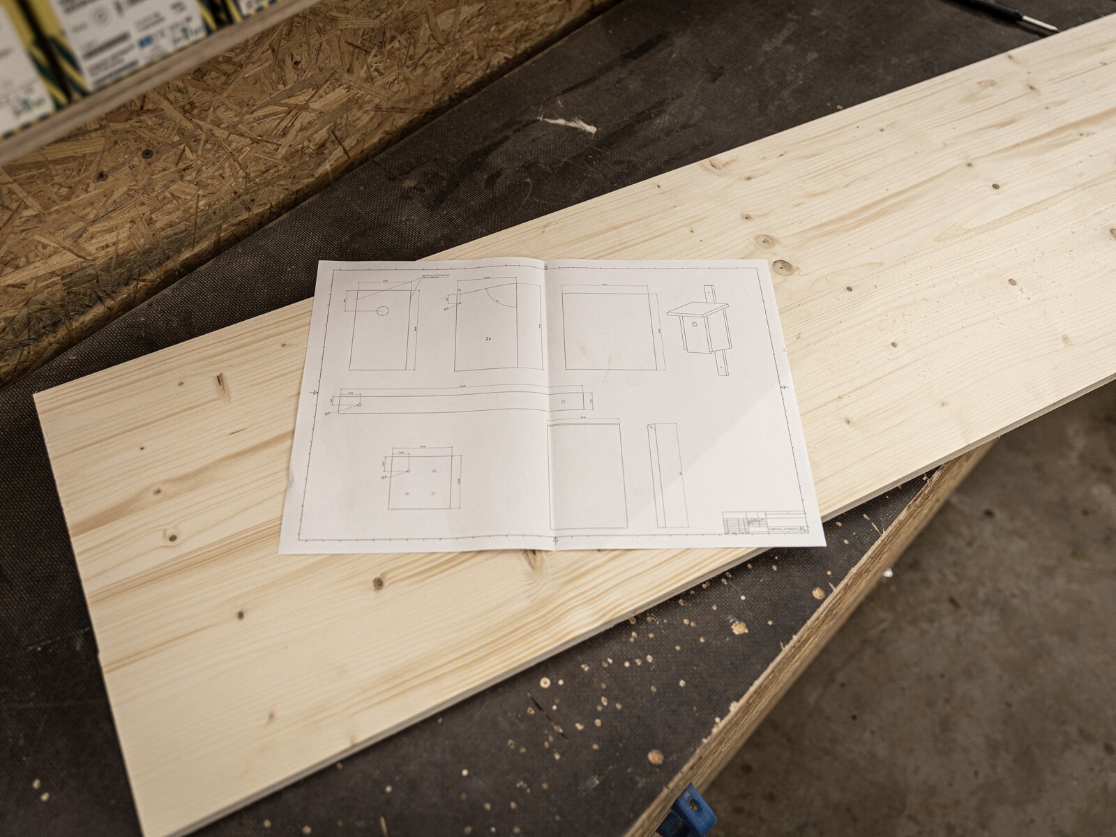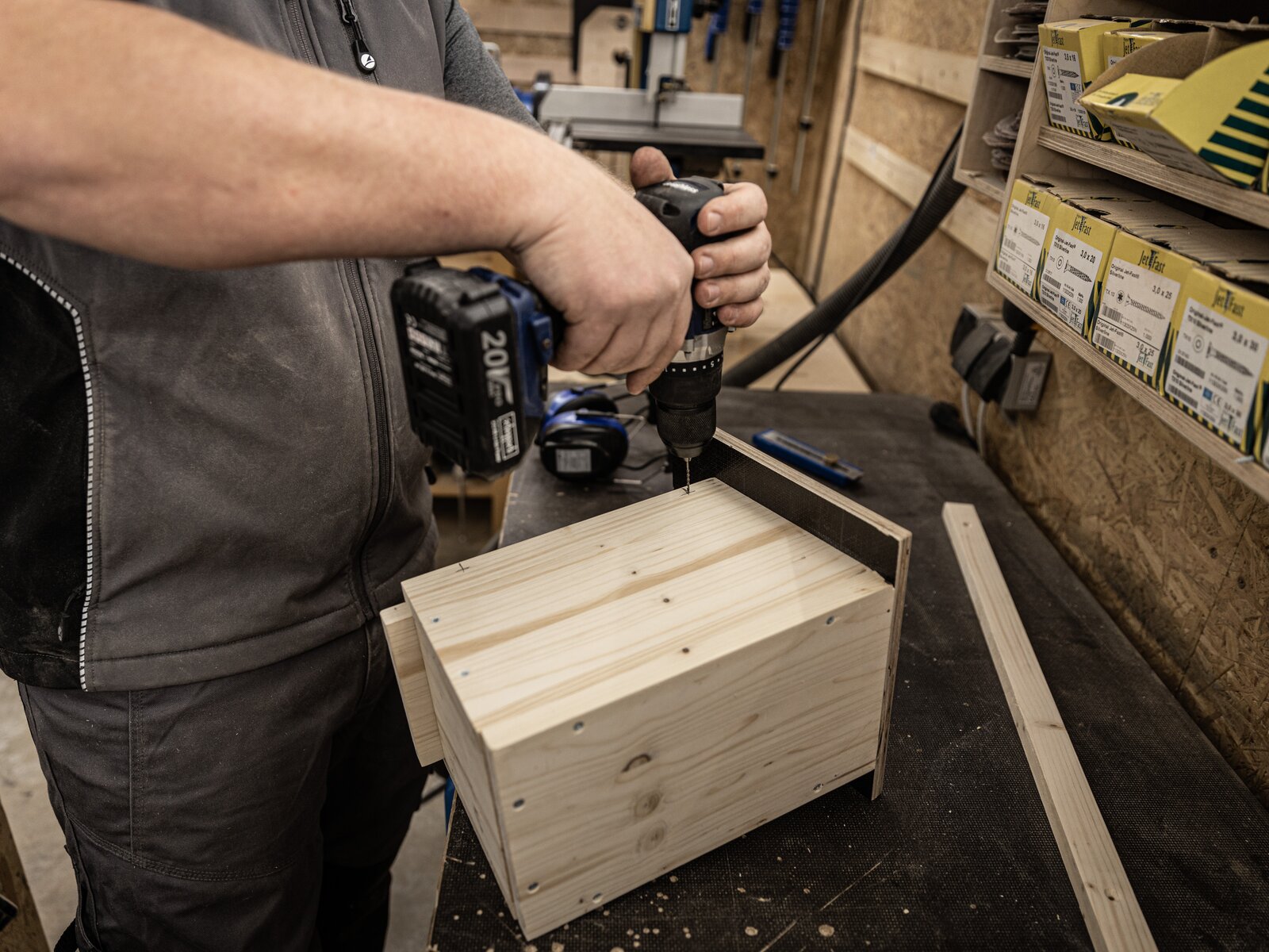 Jetzt können die Schraublöcher mit einer Tischbohrmaschine oder einem Akkuschrauber vorgebohrt und gesenkt werden. Das Flugloch wird ebenfalls mithilfe einer Tischbohrmaschine mit Forstnerbohrer gebohrt und anschließend mit einem Fräser abgerundet. Zum Schluss wird auch der Boden des Nistkastens mit 4 Lüftungslöchern ausgestattet, auch diese werden mit der Tischbohrmaschine gebohrt.