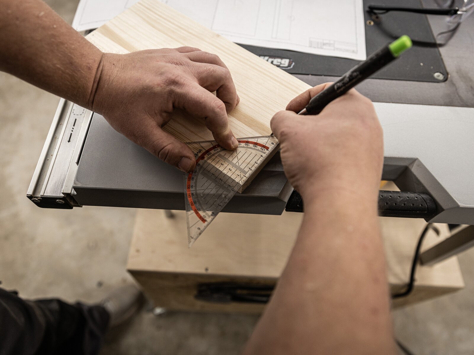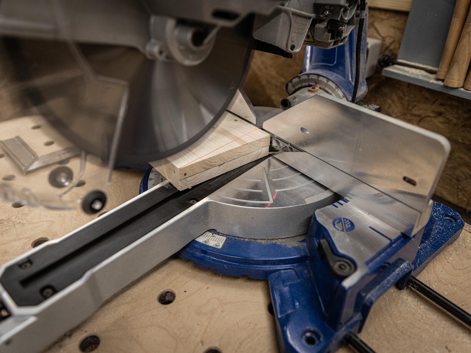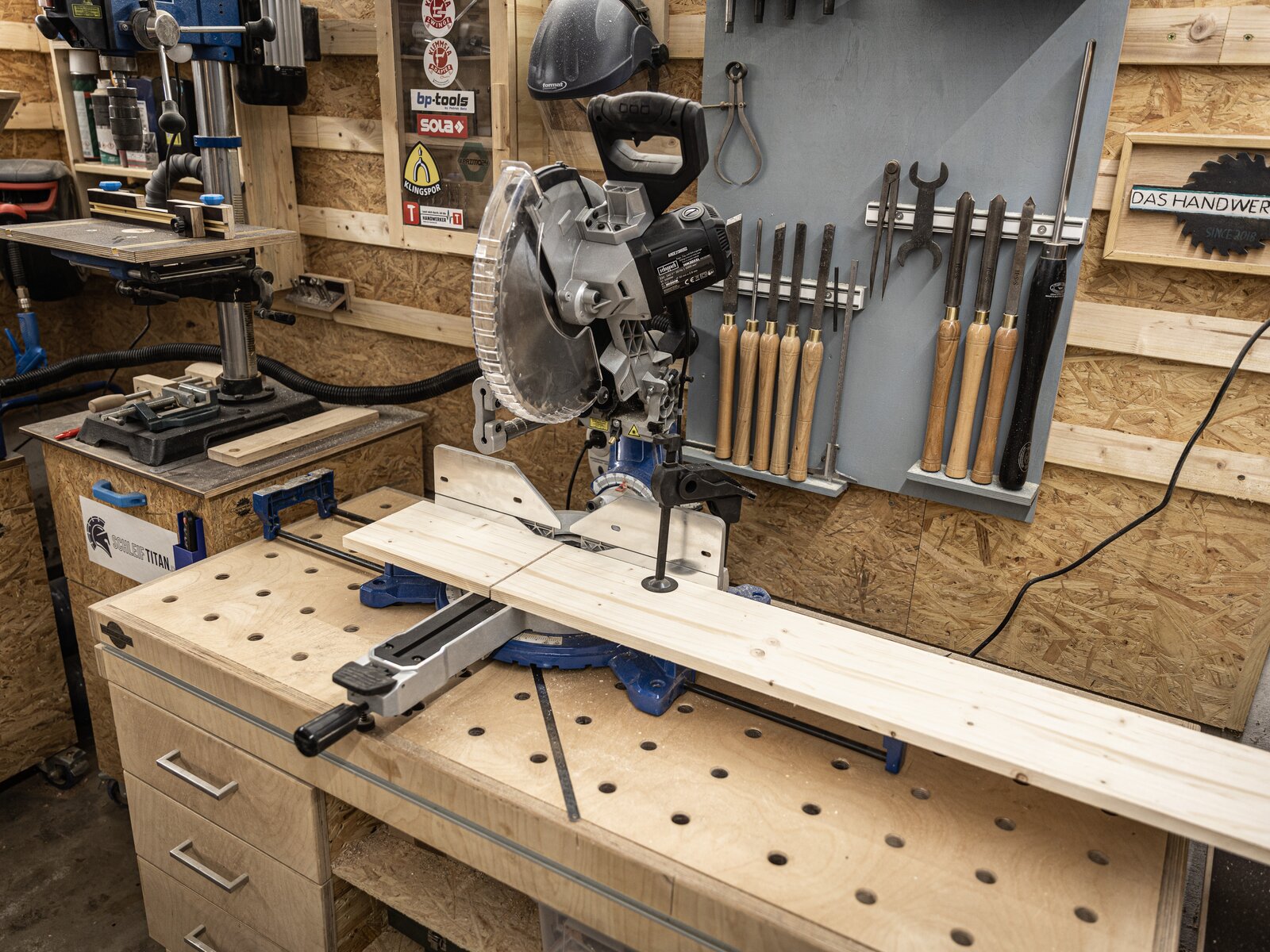 Zuerst werden die einzelnen Bauteile mithilfe einer Tischkreissäge bzw. einer Kapp-, Zug- und Gehrungssäge zugeschnitten. Die Bauteile, die mit einem Winkel versehen werden, benötigen ein zusätzliches Aufmaß von ca. 1 cm.