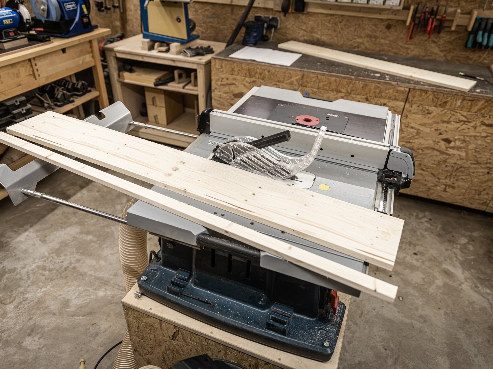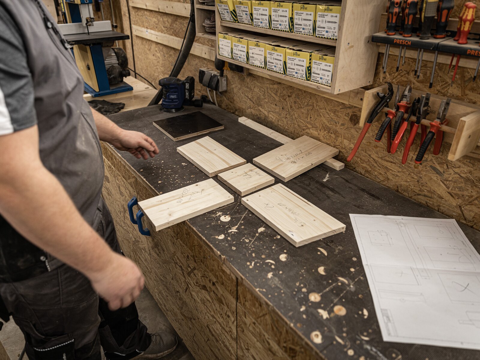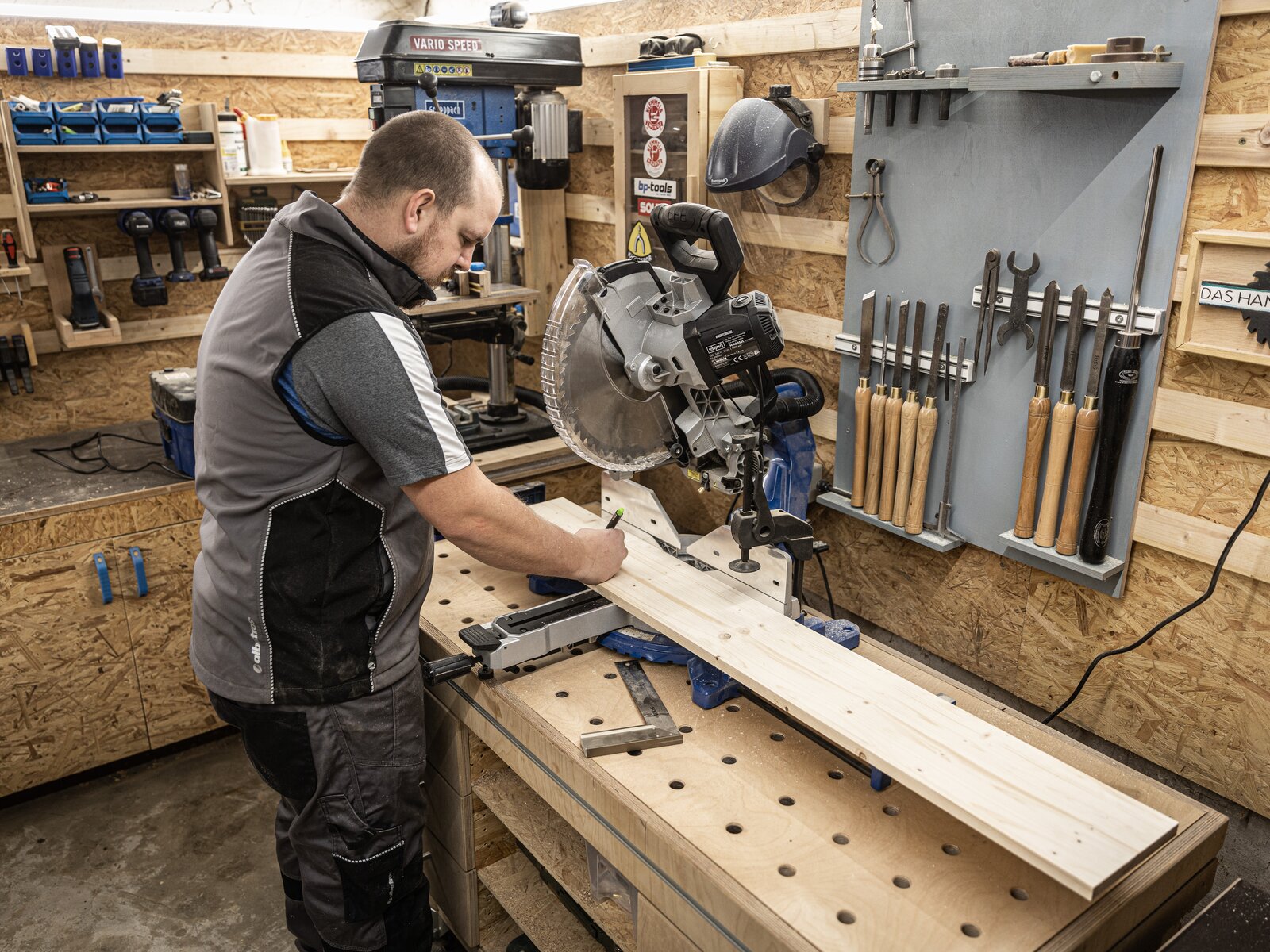 Zuerst werden die einzelnen Bauteile mithilfe einer Tischkreissäge bzw. einer Kapp-, Zug- und Gehrungssäge zugeschnitten. Die Bauteile, die mit einem Winkel versehen werden, benötigen ein zusätzliches Aufmaß von ca. 1 cm.