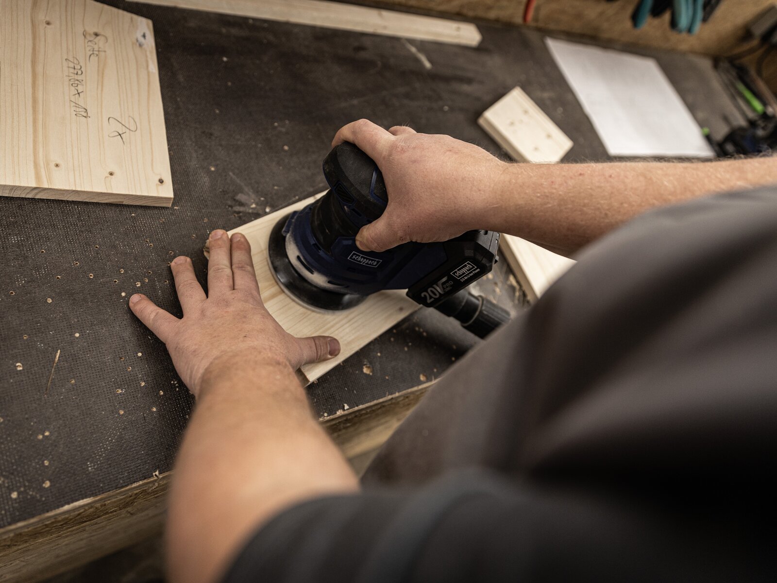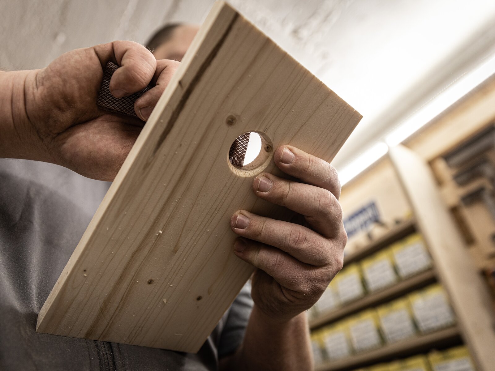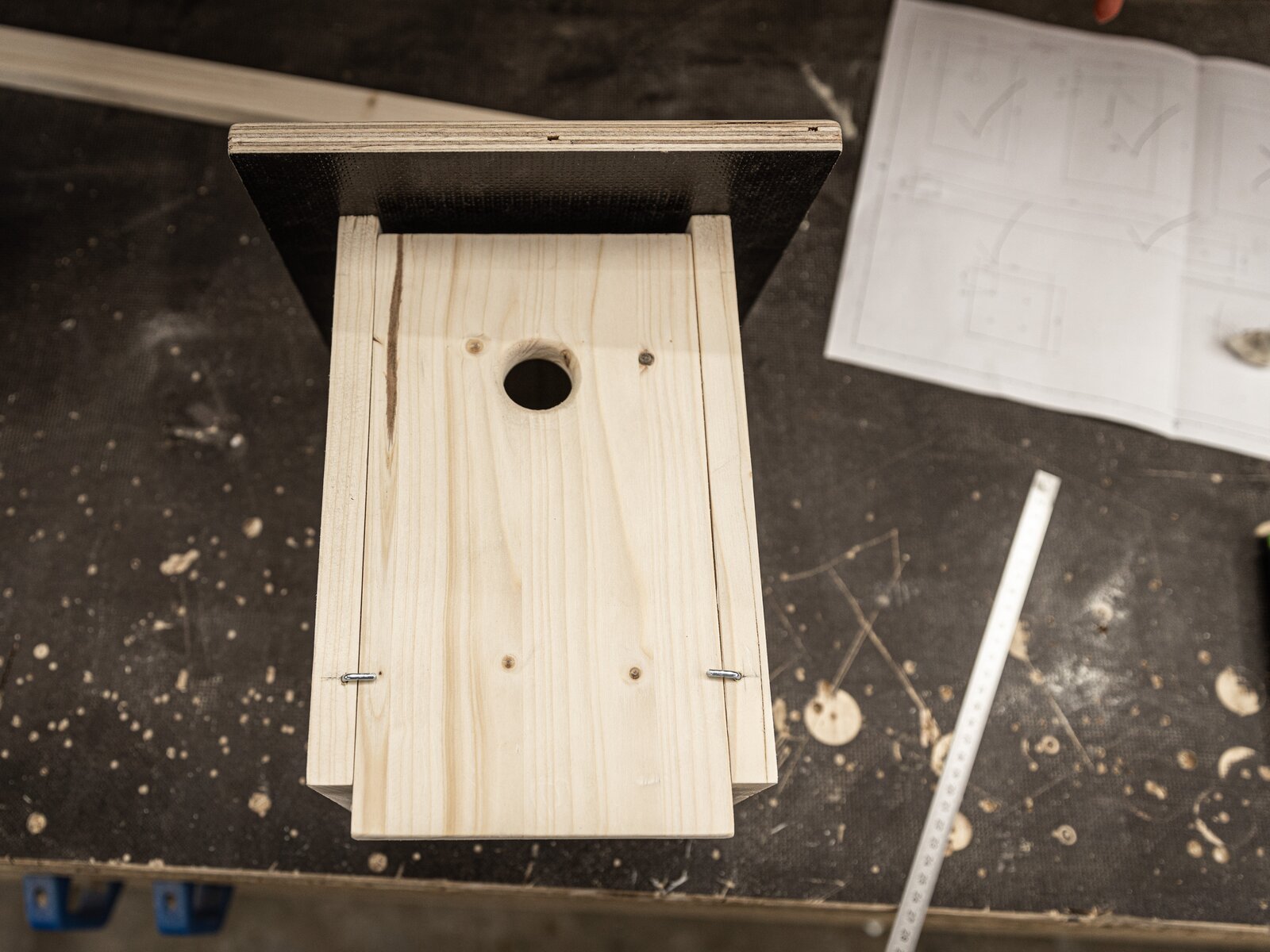 Vor dem Zusammenbauen können alle Bauteile mit einem Exzenterschleifer geschliffen und die Innenseiten mithilfe von Schleifpapier leicht aufgeraut werden. Jetzt kann das Vogelhäuschen fertig zusammengebaut werden.