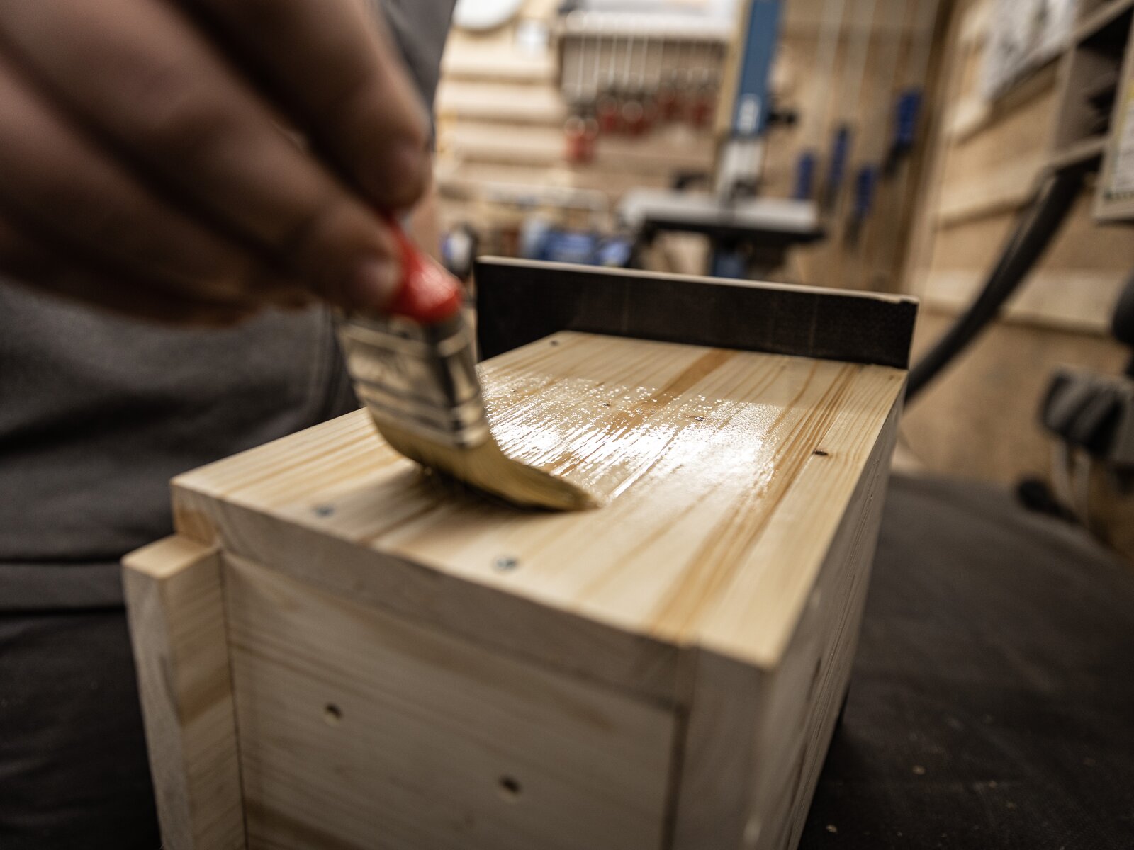 Zum Schluss können die Außenseiten des Nistkastens noch mit einer umweltfreundlichen Lasur behandelt werden. Jetzt ist das Vogelhäuschen bereit für den Einsatz und kann draußen aufgehängt werden