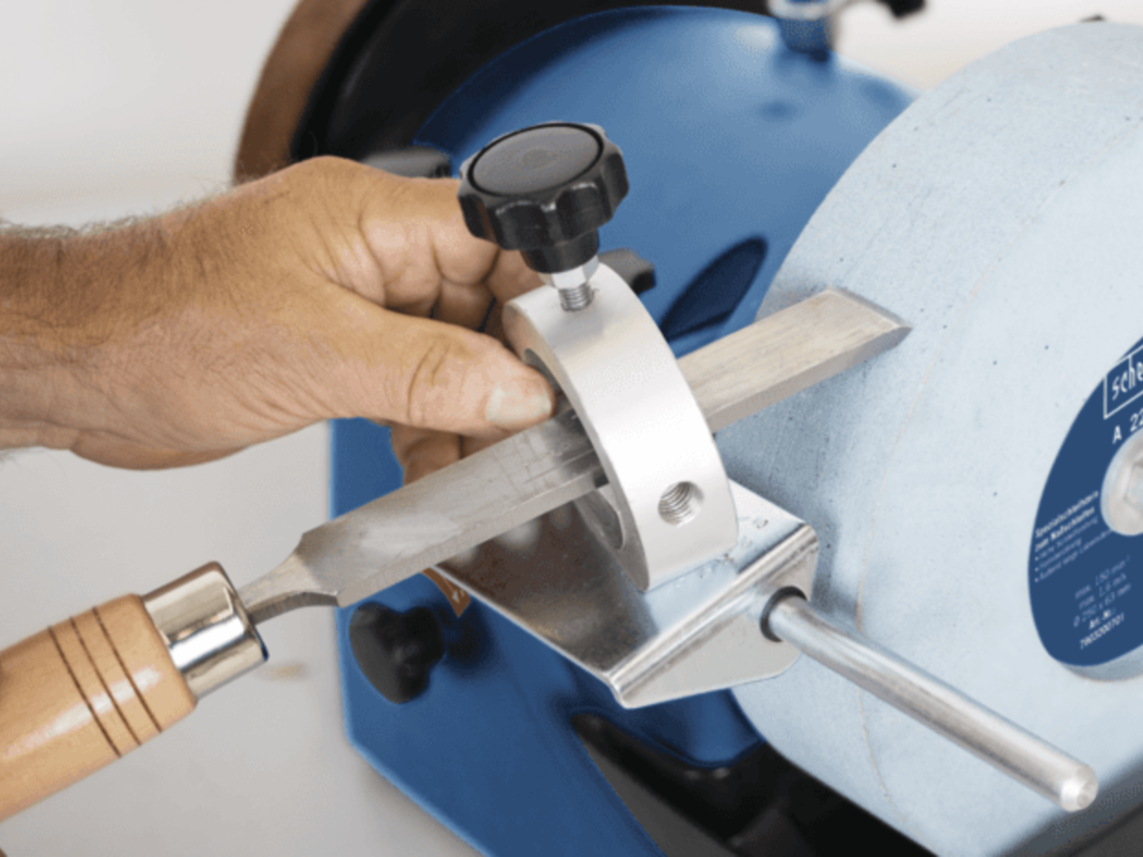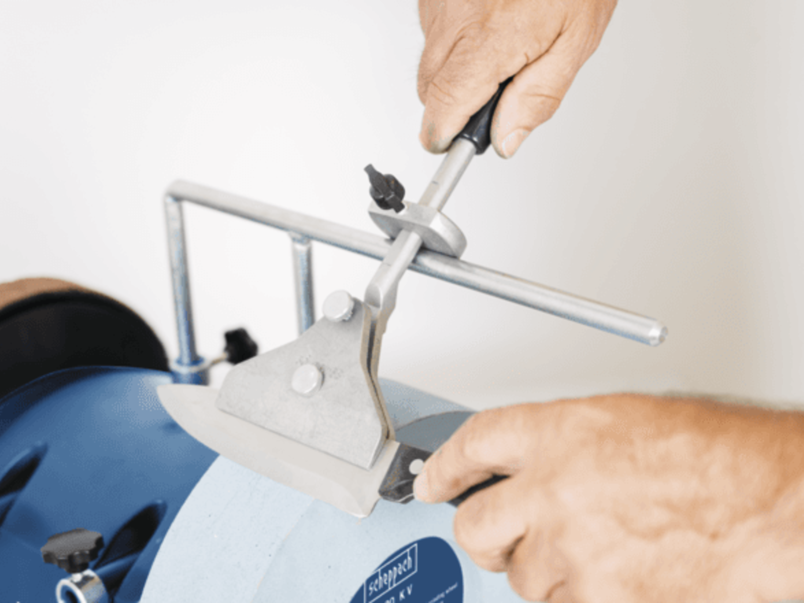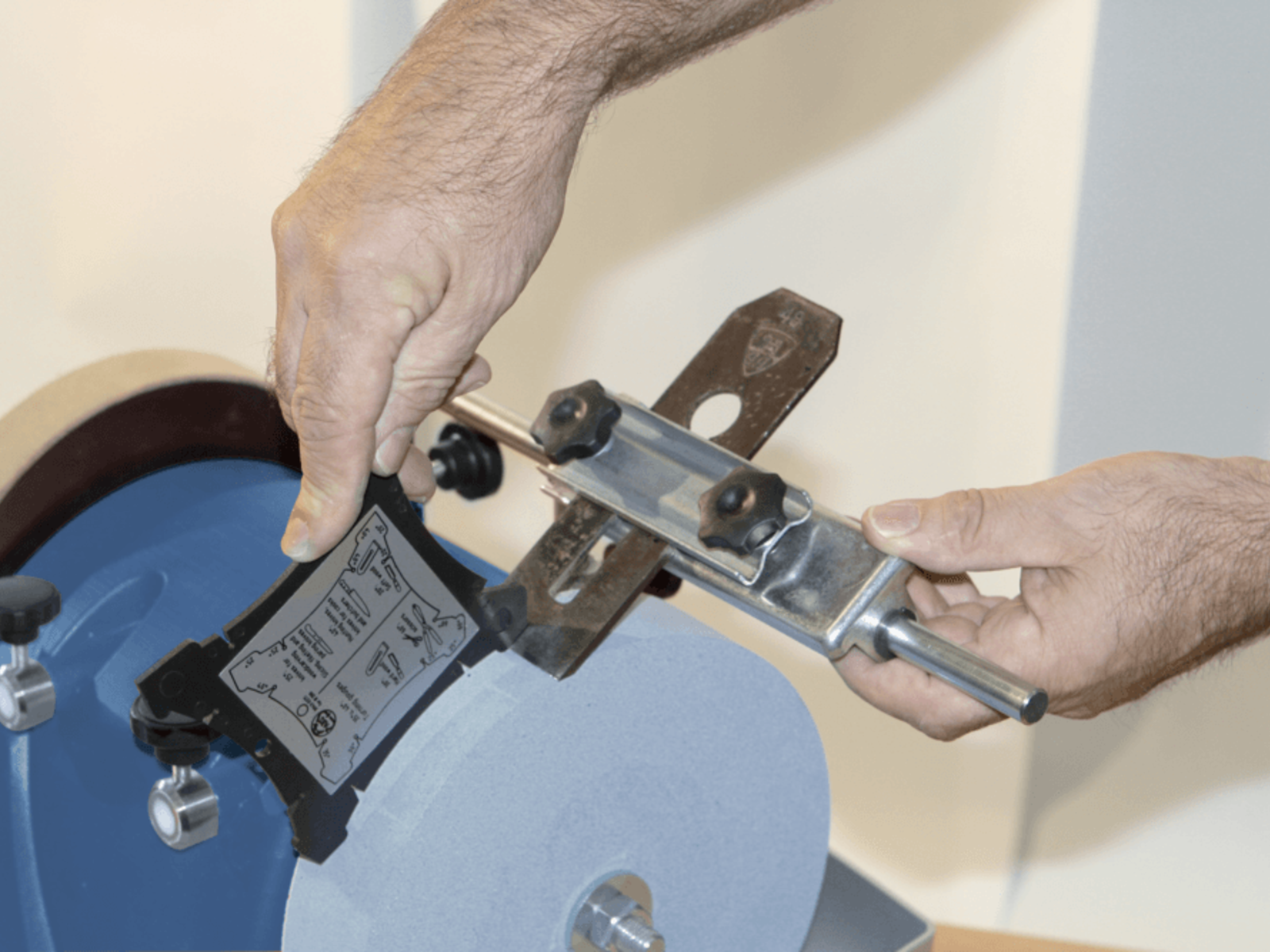 Für jeden Schleif-Fall gibt es eine andere Schleif-Vorrichtung, um den richtigen Winkel einstellen und während des Schleifens auch halten zu können. Für eine Axt genügt z.B. eine V 40 Auflage, auf der das Werkzeug mit seiner gebogenen Schneide manuell hin- und her bewegt wird. Für eine Schere oder ein Messer sind dagegen komplexere und starre Halterungen nötig, um einen perfekten Schliff zu erreichen.