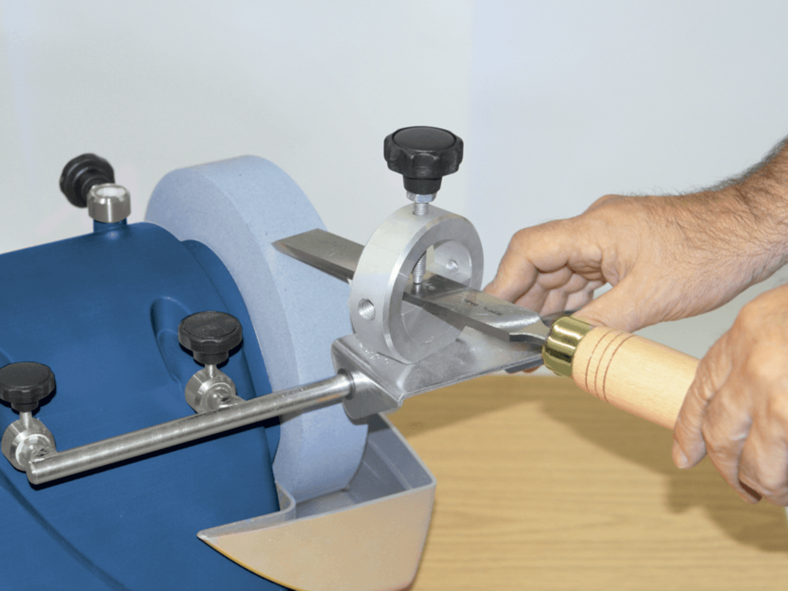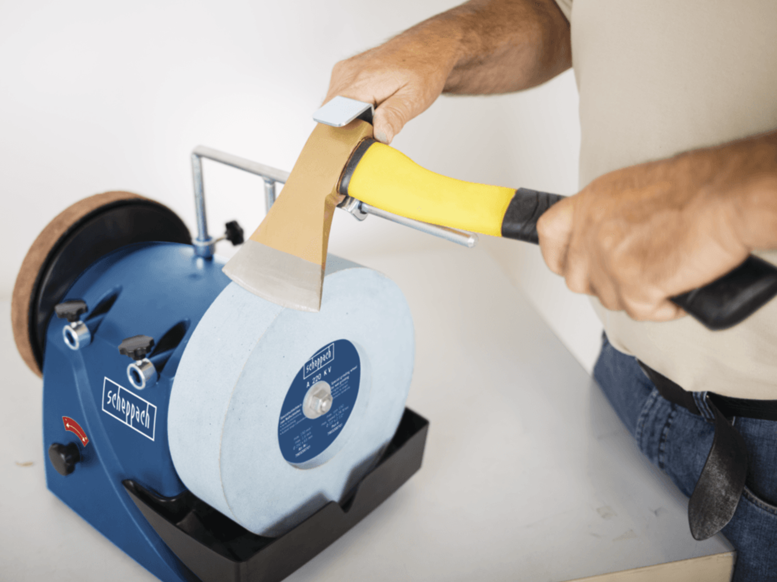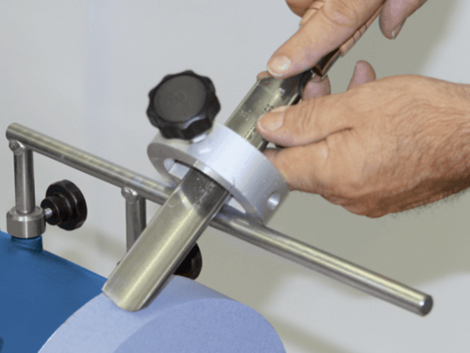 Für jeden Schleif-Fall gibt es eine andere Schleif-Vorrichtung, um den richtigen Winkel einstellen und während des Schleifens auch halten zu können. Für eine Axt genügt z.B. eine V 40 Auflage, auf der das Werkzeug mit seiner gebogenen Schneide manuell hin- und her bewegt wird. Für eine Schere oder ein Messer sind dagegen komplexere und starre Halterungen nötig, um einen perfekten Schliff zu erreichen.