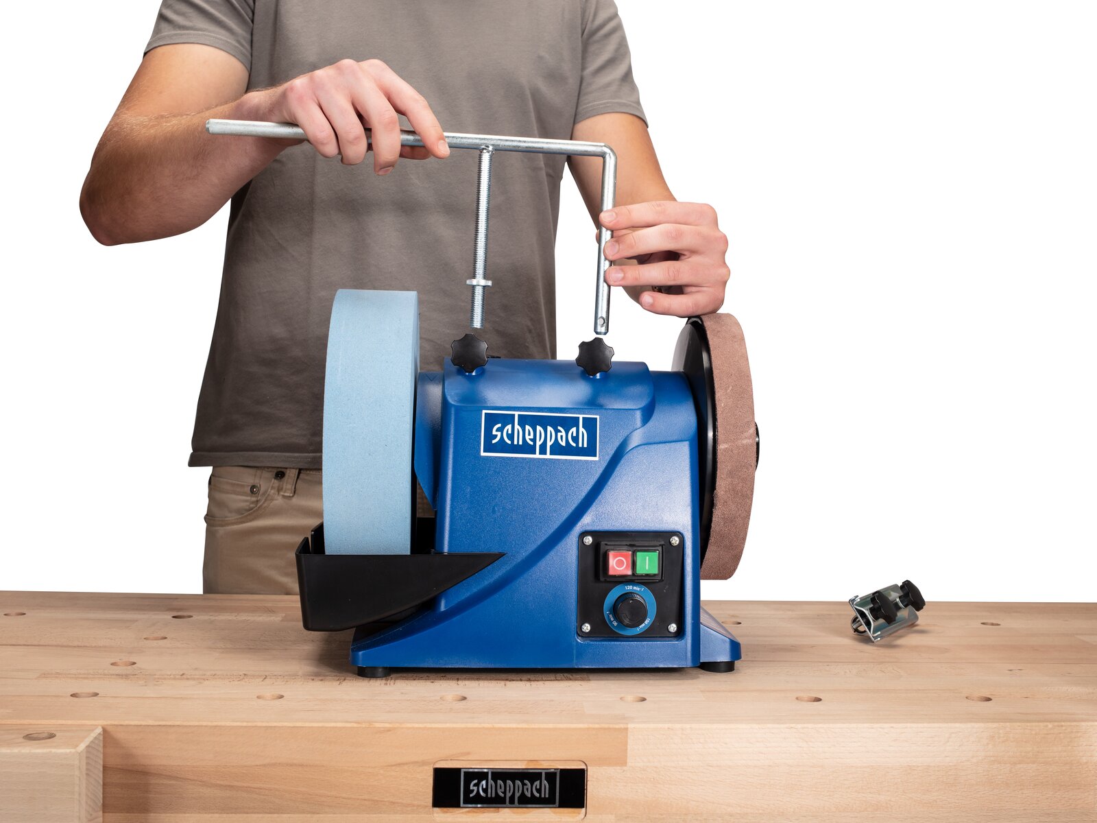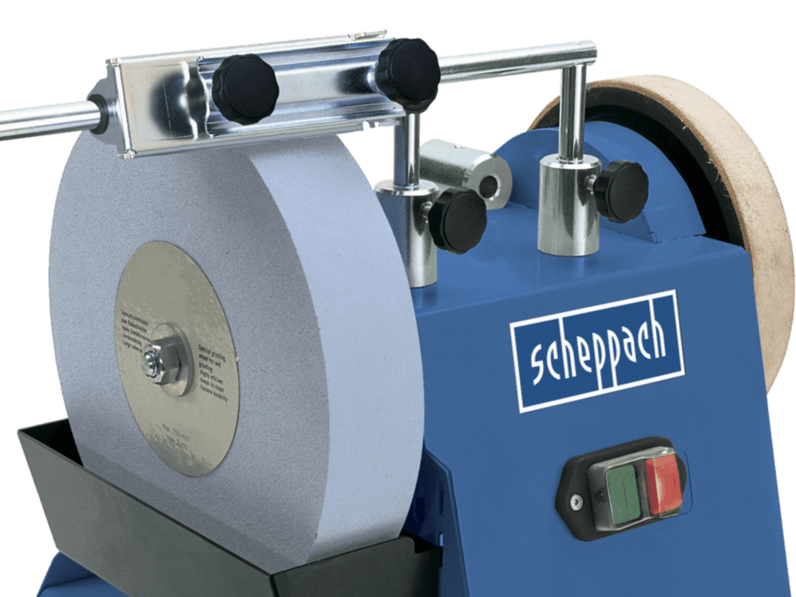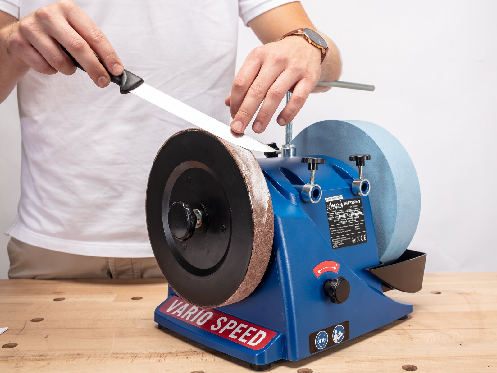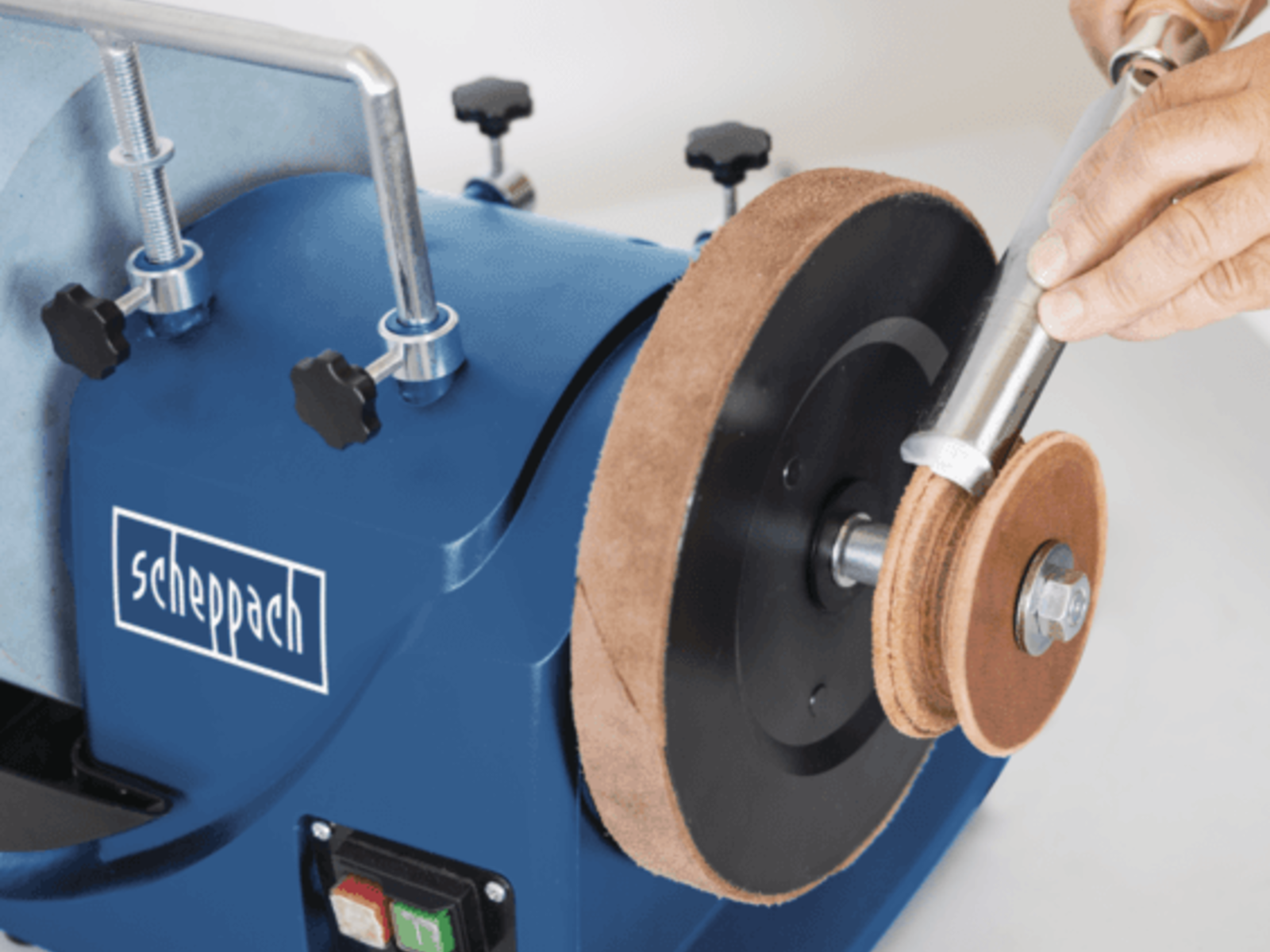 Um Messer, Scheren und Werkzeuge nach dem Schleifen zu entgraten und zu polieren verfügen die scheppach Tiger Schleifmaschinen über eine zweite Scheibe, eine Leder-Abziehscheibe. Zusammen mit der mitgelieferten Abziehpaste werden die frisch geschliffenen Werkzeuge auf dieser Scheibe entgratet und poliert. Ist das Leder abgenutzt lässt es sich leicht ersetzen. Sogar die gesamte Lederscheibe kann abgenommen werden, ohne den Lauf der Maschine zu beeinträchtigen.