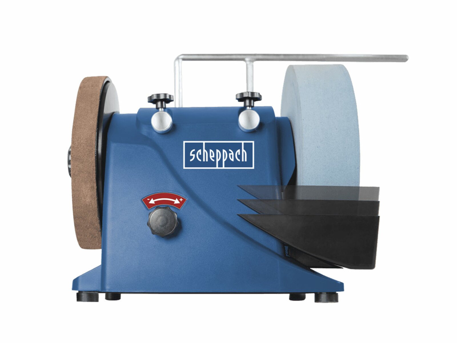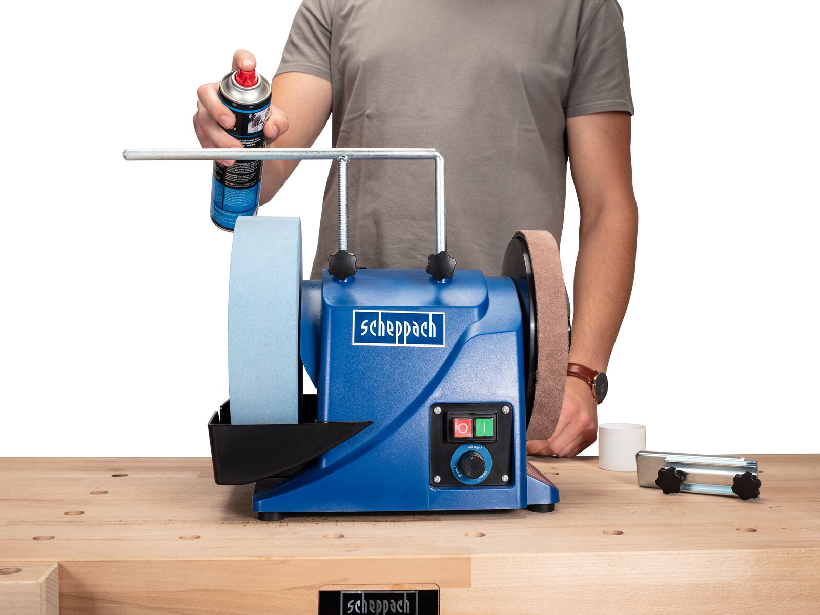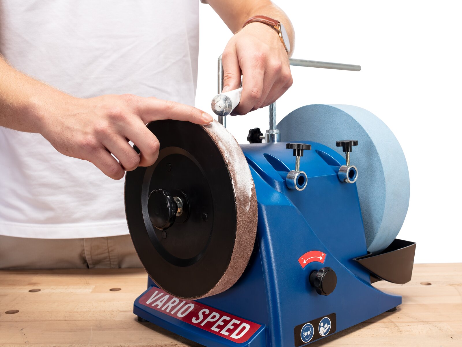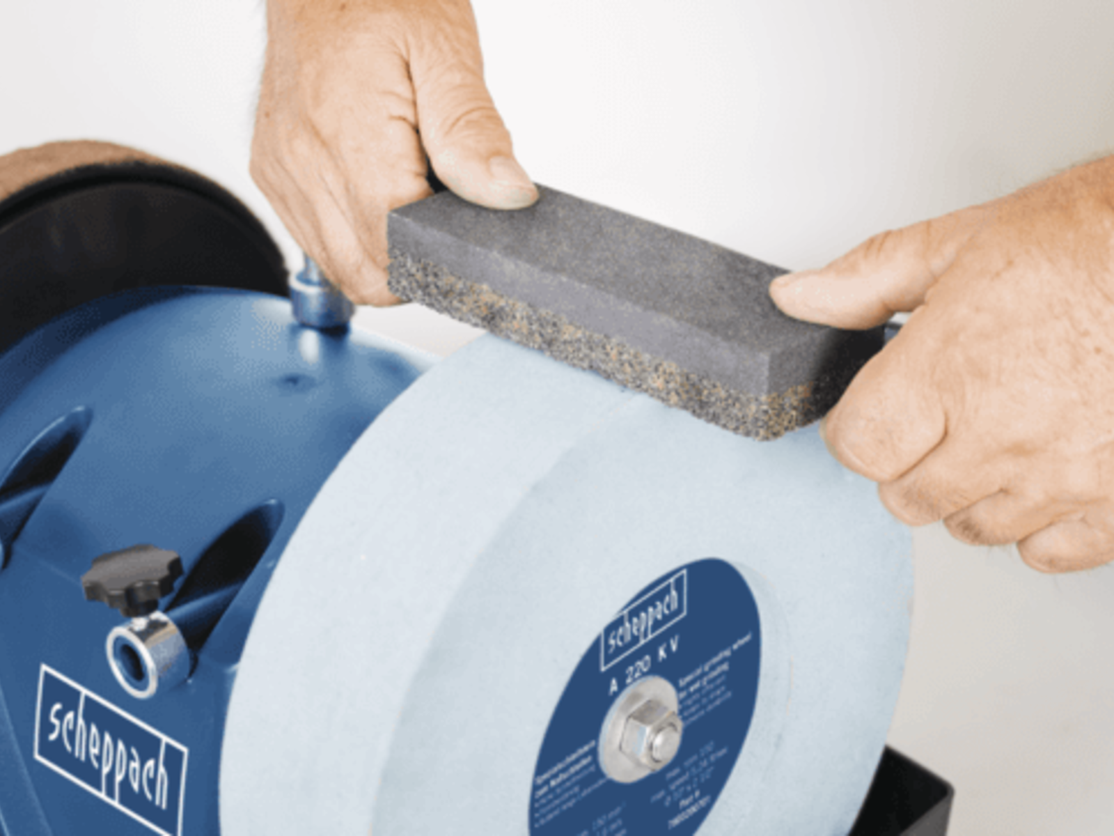 Um Messer, Scheren und Werkzeuge nach dem Schleifen zu entgraten und zu polieren verfügen die scheppach Tiger Schleifmaschinen über eine zweite Scheibe, eine Leder-Abziehscheibe. Zusammen mit der mitgelieferten Abziehpaste werden die frisch geschliffenen Werkzeuge auf dieser Scheibe entgratet und poliert. Ist das Leder abgenutzt lässt es sich leicht ersetzen. Sogar die gesamte Lederscheibe kann abgenommen werden, ohne den Lauf der Maschine zu beeinträchtigen.