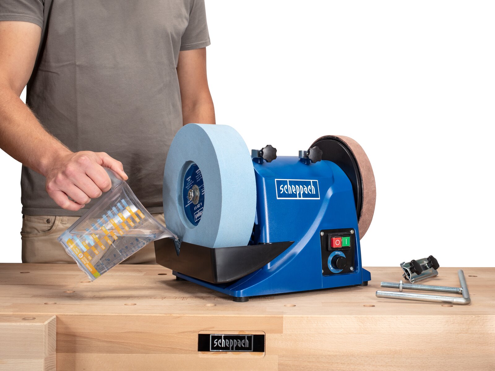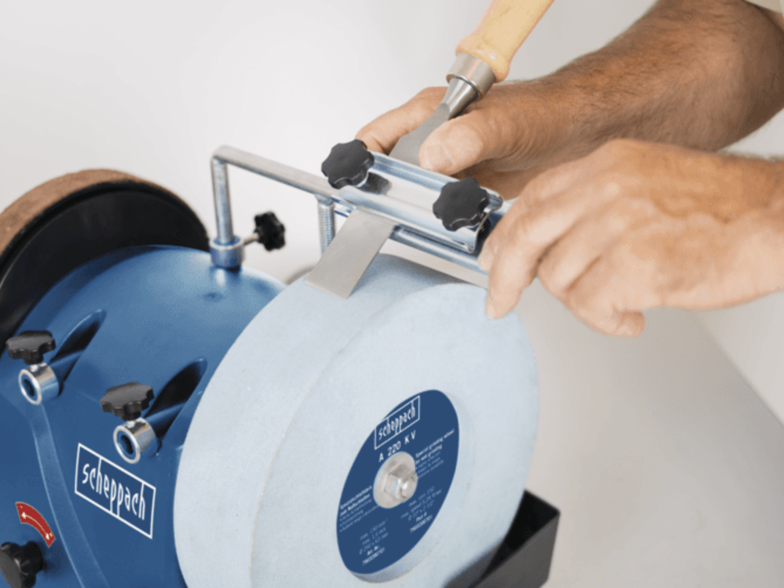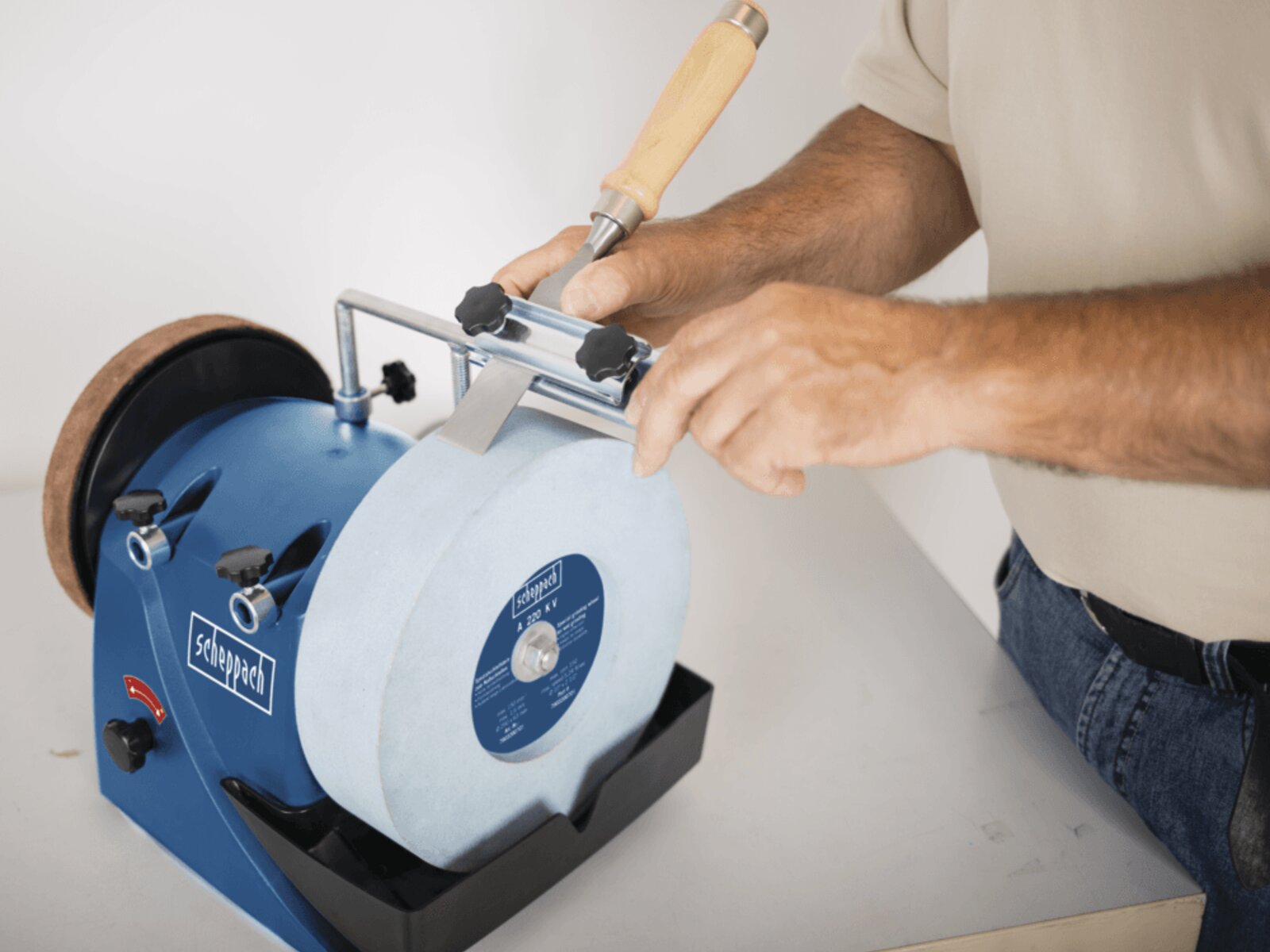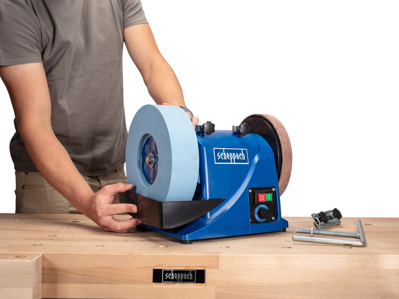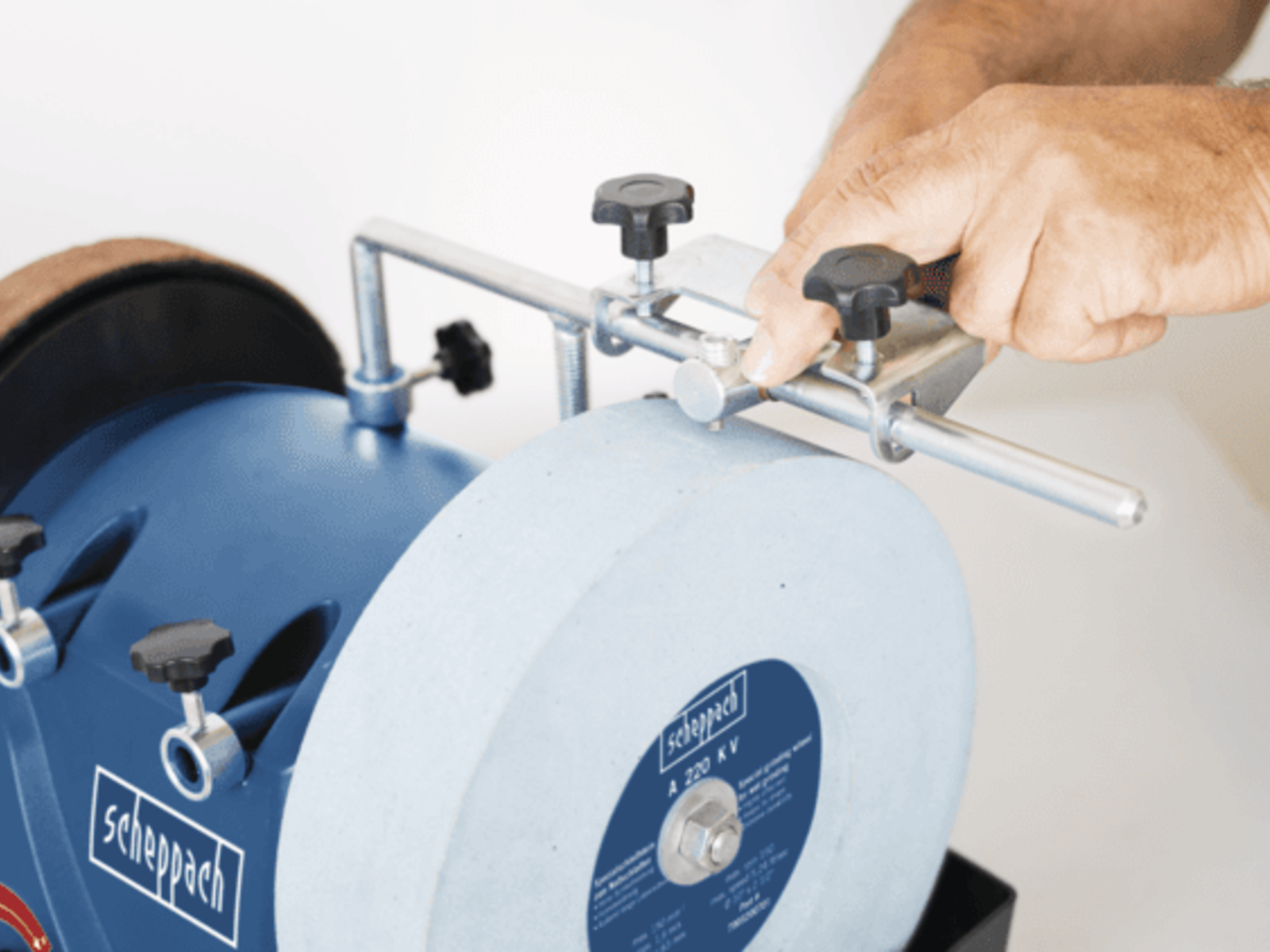 Um Messer, Scheren und Werkzeuge nach dem Schleifen zu entgraten und zu polieren verfügen die scheppach Tiger Schleifmaschinen über eine zweite Scheibe, eine Leder-Abziehscheibe. Zusammen mit der mitgelieferten Abziehpaste werden die frisch geschliffenen Werkzeuge auf dieser Scheibe entgratet und poliert. Ist das Leder abgenutzt lässt es sich leicht ersetzen. Sogar die gesamte Lederscheibe kann abgenommen werden, ohne den Lauf der Maschine zu beeinträchtigen.