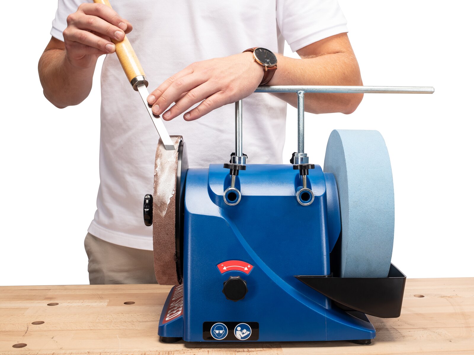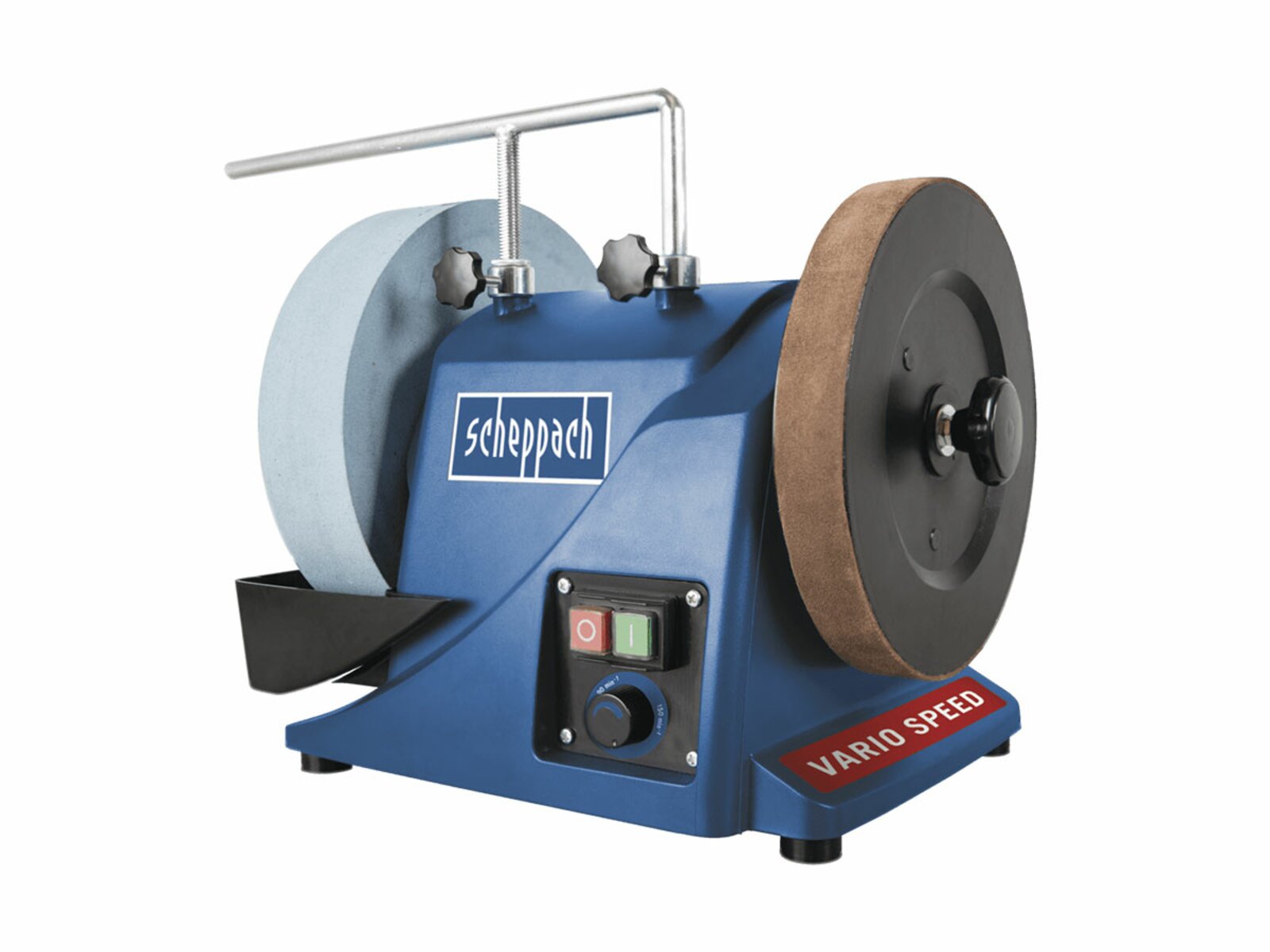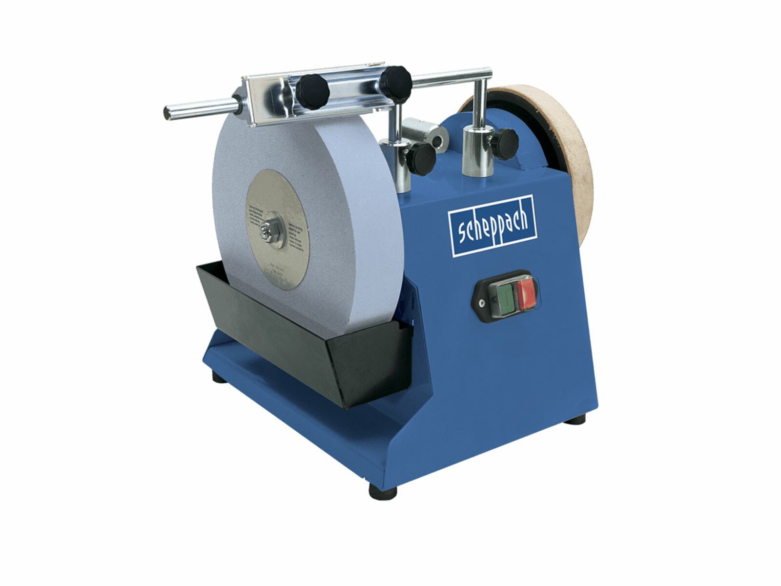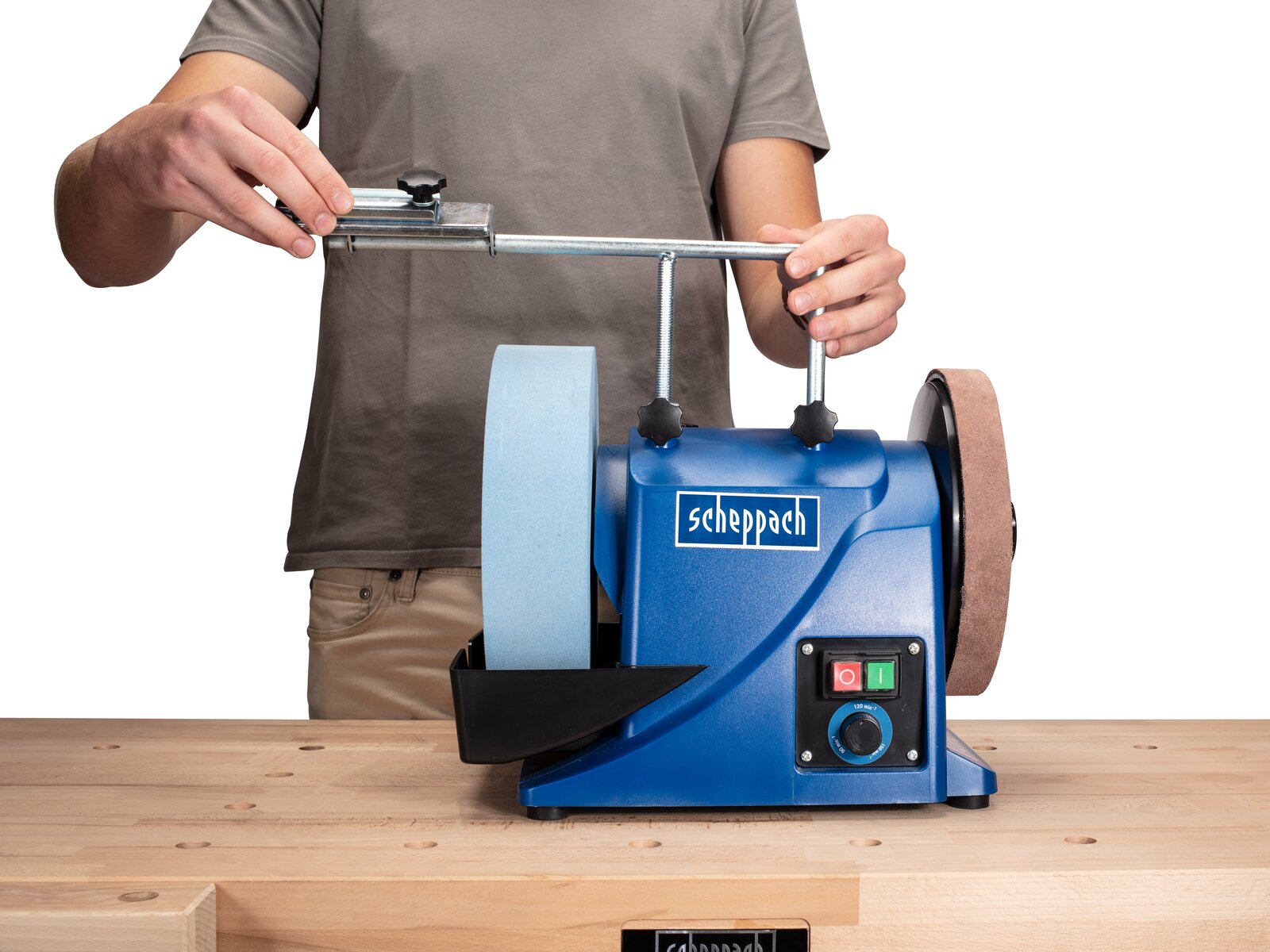 Um Messer, Scheren und Werkzeuge nach dem Schleifen zu entgraten und zu polieren verfügen die scheppach Tiger Schleifmaschinen über eine zweite Scheibe, eine Leder-Abziehscheibe. Zusammen mit der mitgelieferten Abziehpaste werden die frisch geschliffenen Werkzeuge auf dieser Scheibe entgratet und poliert. Ist das Leder abgenutzt lässt es sich leicht ersetzen. Sogar die gesamte Lederscheibe kann abgenommen werden, ohne den Lauf der Maschine zu beeinträchtigen.