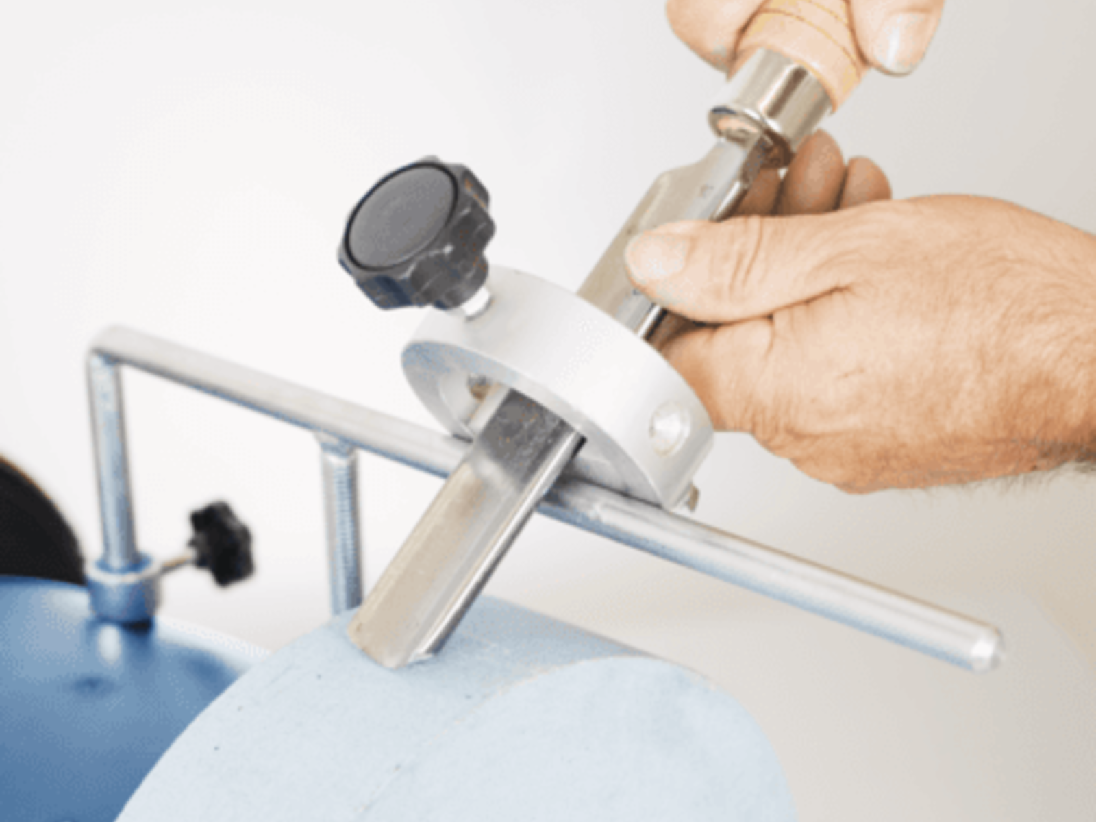 1. Die Neigungseinstellung erfolgt mithilfe der mitgelieferten Winkellehre. Dazu vergleicht man den Winkel der Schleiffase mit den Kerben der Winkellehre. Nun wird diese mit dem gewünschten Winkel an die Spitze des Werkzeugs gehalten. Durch Verändern der Höhe der Universalstütze stößt das vordere Ende der Winkellehre gerade an den Schleifstein an. Dabei muss die Winkellehre immer mit der Werkzeugspitze fluchten.