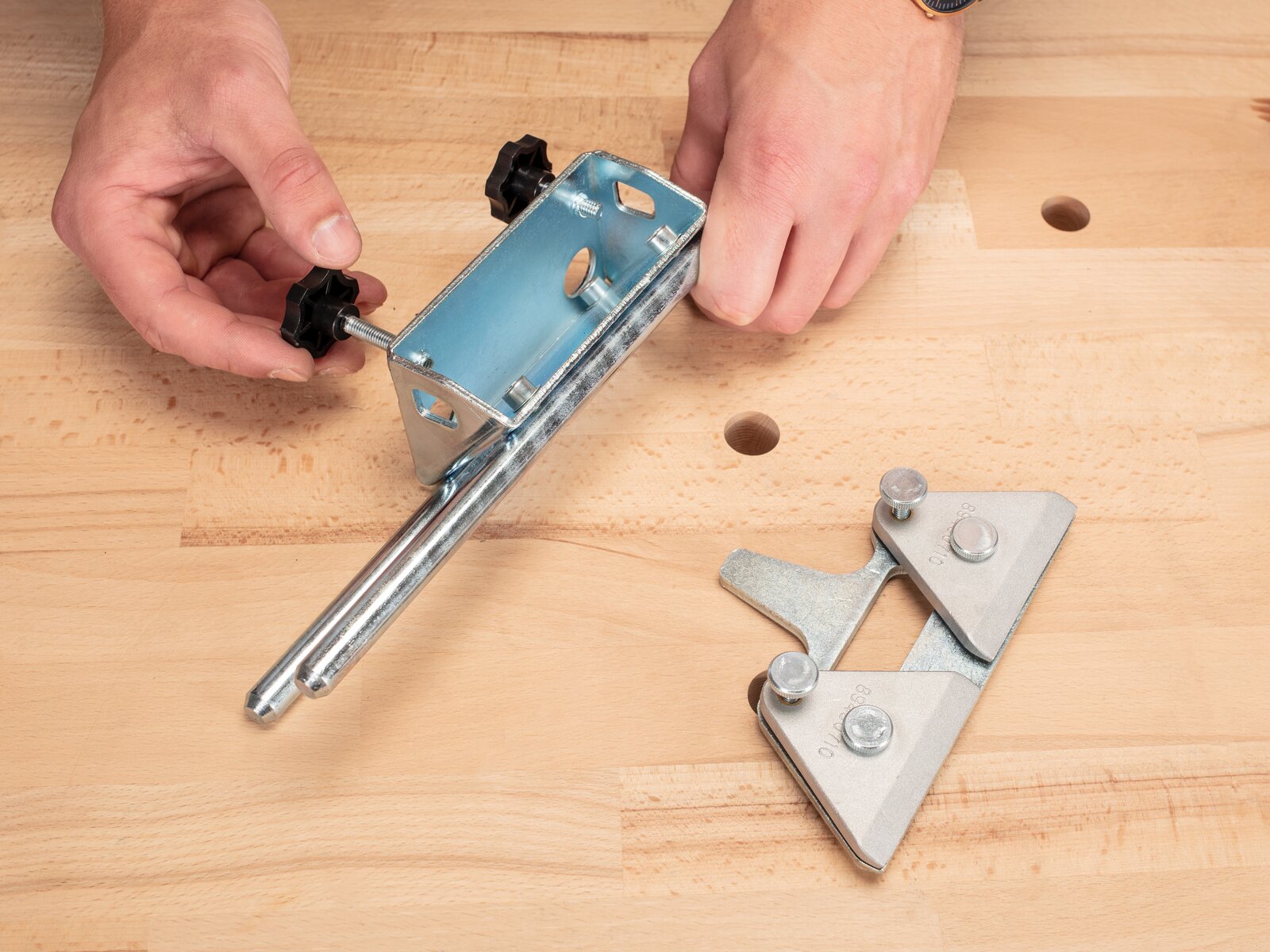 3. Schrägeisen einspannen und mithilfe der Skalierung auf der Montageplatte den richtigen Winkel einstellen bzw. den Sitz des Werkzeugs mit der Schneidenschräge abstimmen.