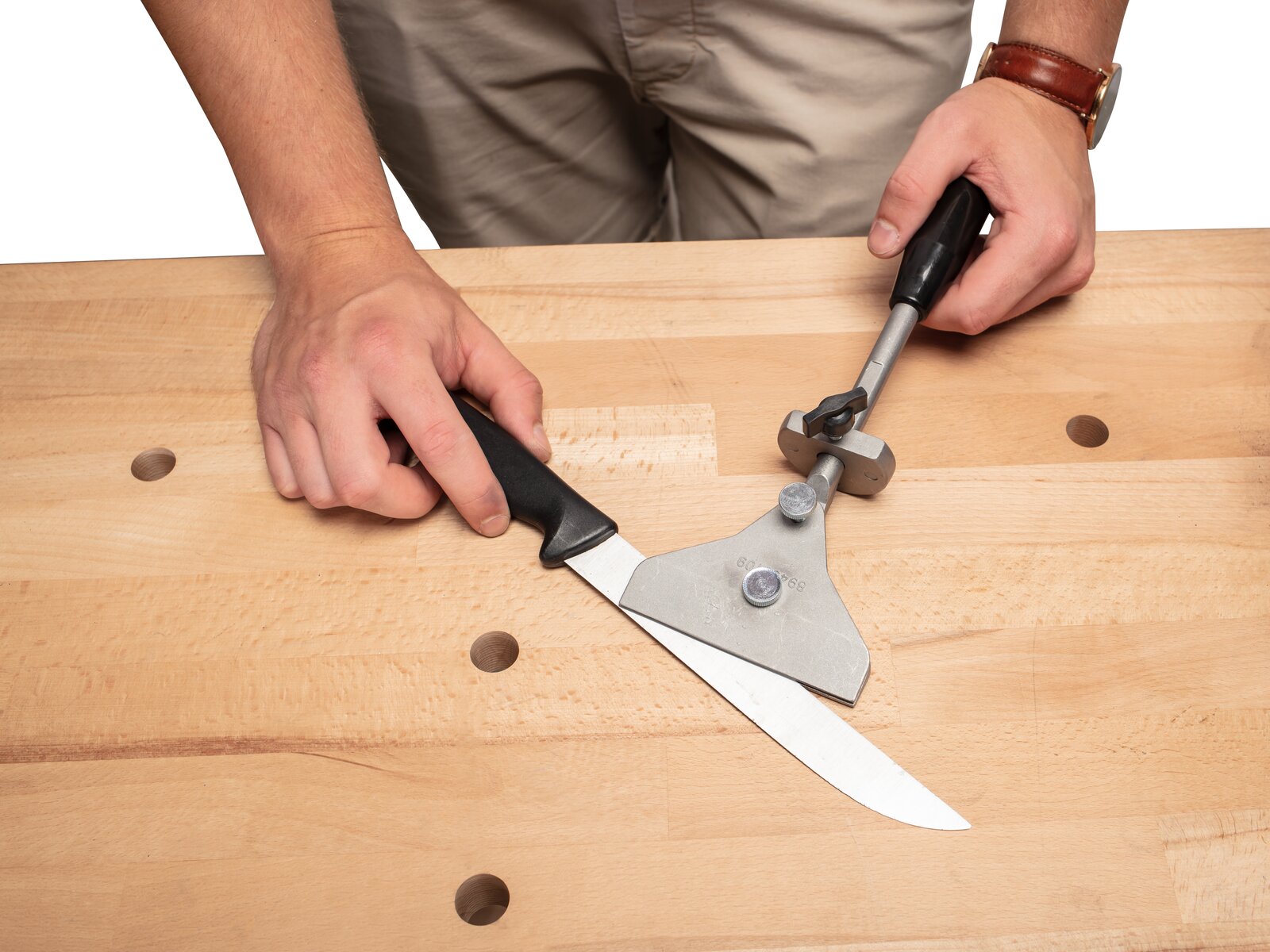 1. Je nach Länge der Messer wählt man die große oder kleine Einspannvorrichtung. Das Messer wird bis zum Anschlagpunkt eingelegt und mit den Schrauben festgespannt.