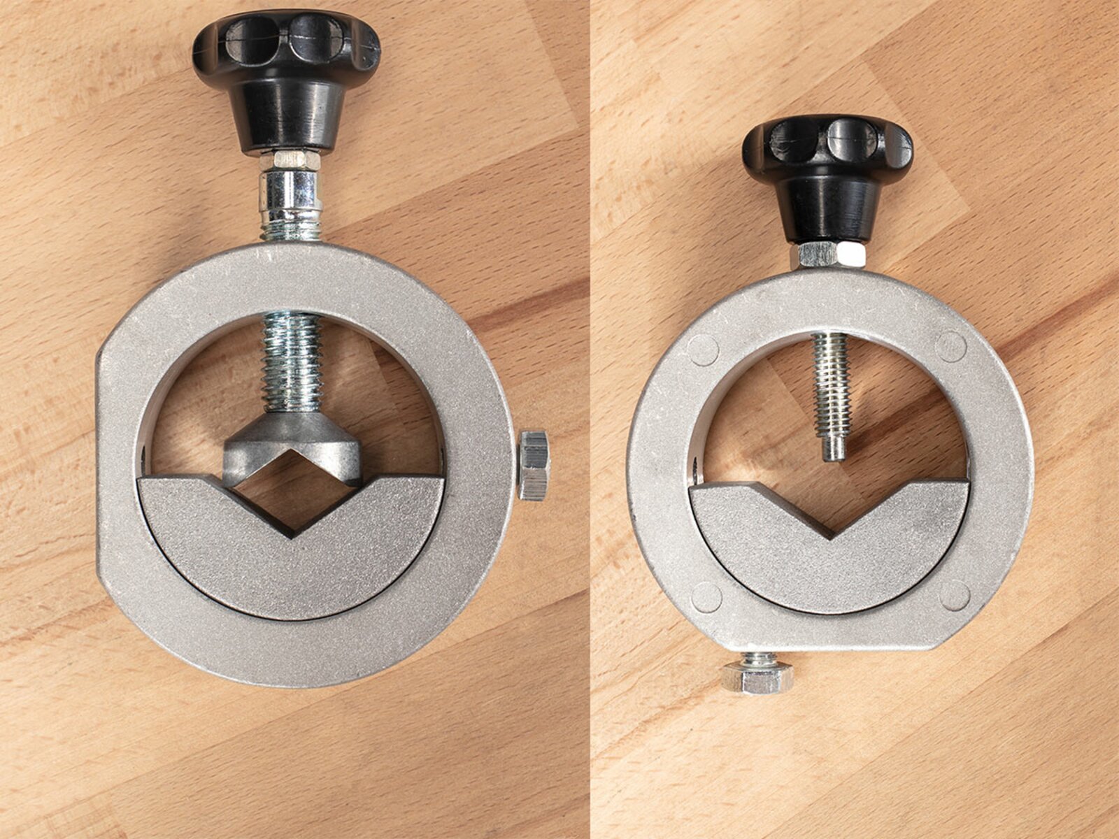 1. Die beiden Bilder zeigen links die Halterung für Hohleisen und rechts das für Schrägeisen umgebaute Teil. Schraube und V-Aufnahme wurden versetzt.