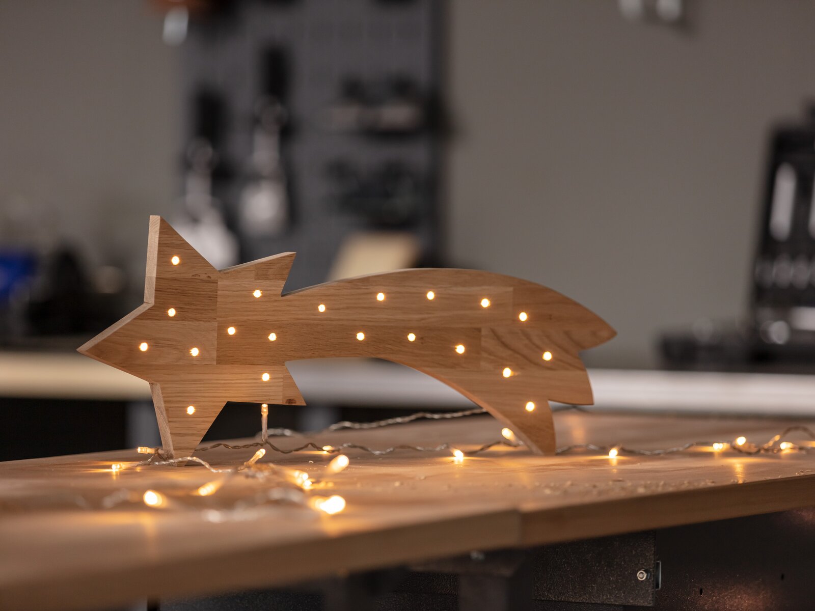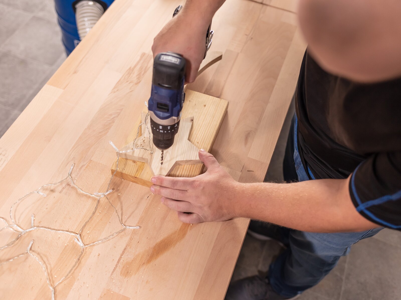 Mit Hilfe eines Akku-Schraubers können im Anschluss die Bohrlöcher für die LED-Lichterkette angebracht werden. Dazu vorab die Lichterkette auf dem Werkstück platzieren und so die gewünschte Position der einzelnen Lichter ermitteln.