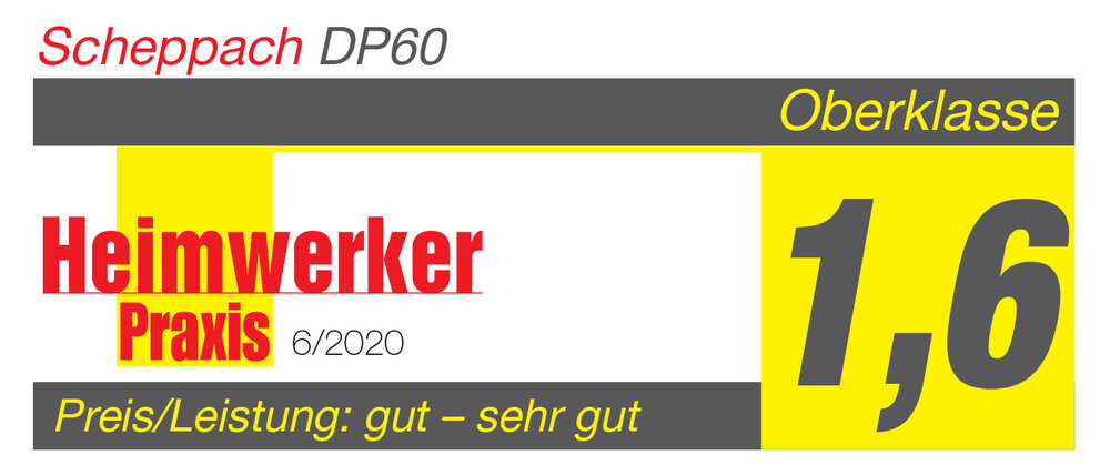 "Heimwerkerpraxis" [test magazine for do-it-yourself enthusiasts] magazine took a close look at the DP60 and returned a positive verdict. The digital display, which enables the speed and drilling depth to be read accurately, was highlighted. Also the switchable lighting and the cross laser, which enables precise drilling. The quick clamp for safe locking of the workpieces was also praised. The testers particularly liked the fact that the lever for operating the drill head can be attached to the right or left side of the housing.