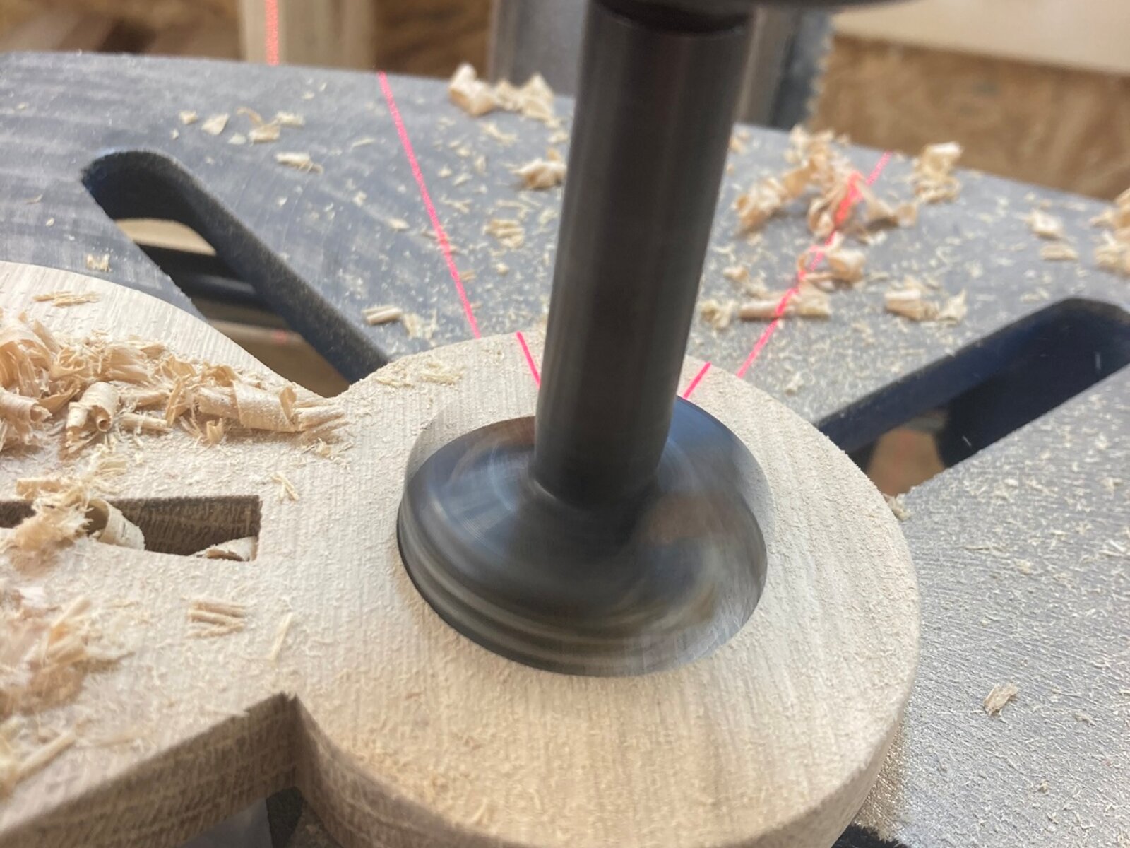 The most important step is next: drilling the hole for the egg. Depending on the size of the eggs, choose a Forstner bit of 30 mm, or 35 mm for very large eggs. In this step, we require a bench drill press. The hole should have a depth of 0.8 cm so the egg can stand up in it.