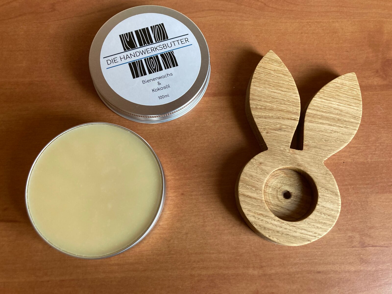 Use a food-safe wood finish for treating the surface. I’m using the timber wax I’ve made myself - the crafting butter - which creates a beautiful stain and water-resistant layer and lends the work piece a semi-matt gloss.