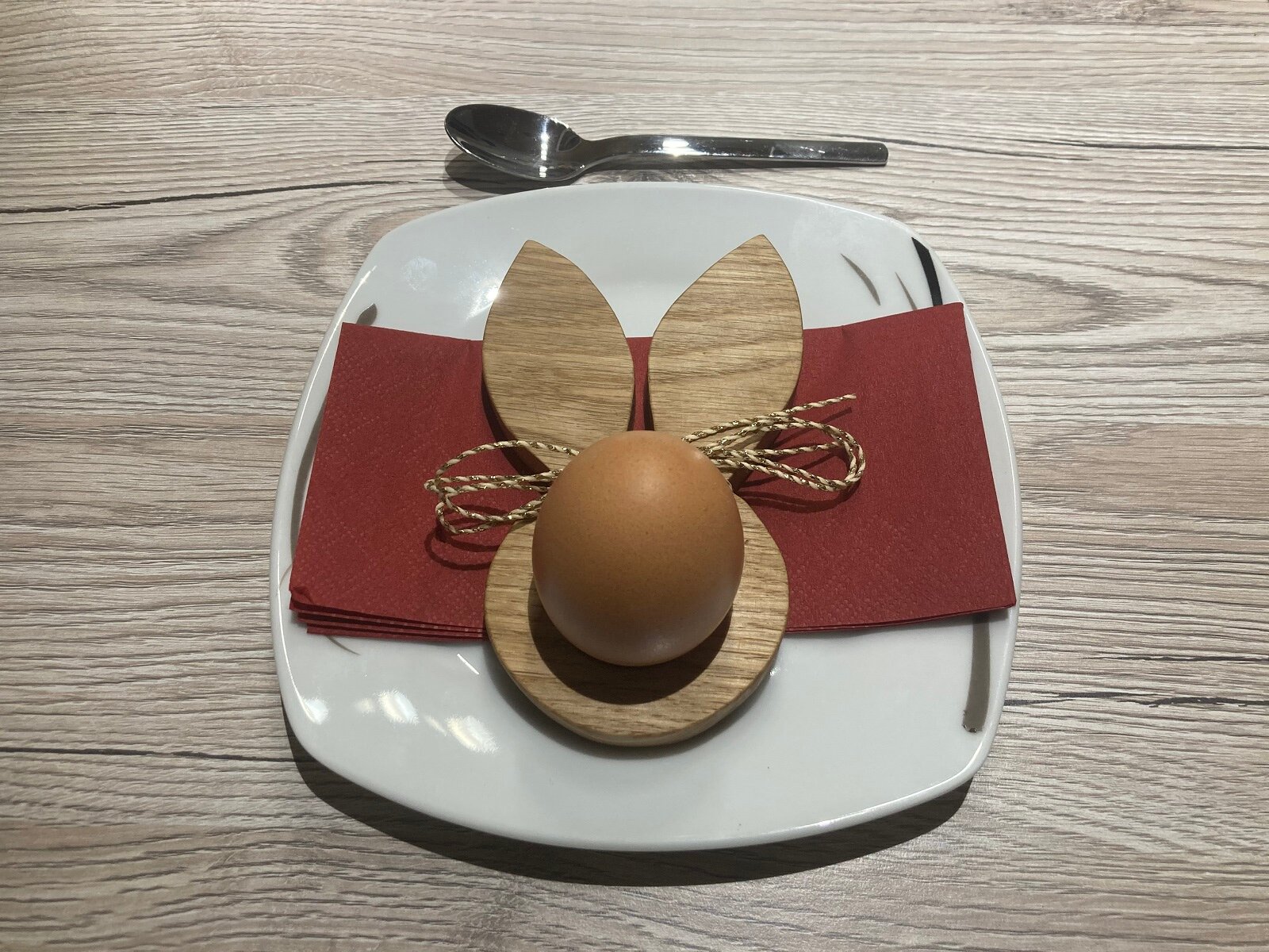 Now tie a pretty bow around the ears, matching the timber and the rest of the table decorations, and the Easter egg cup you made yourself is ready.
